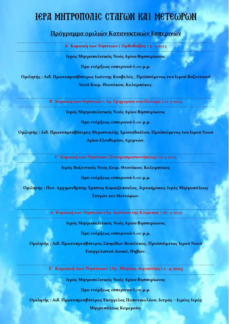 Από την Ιερά Μητρόπολη Σταγών και Μετεώρων ανακοινώθηκε το πρόγραμμα ομιλιών κατανυκτικών εσπερινών.