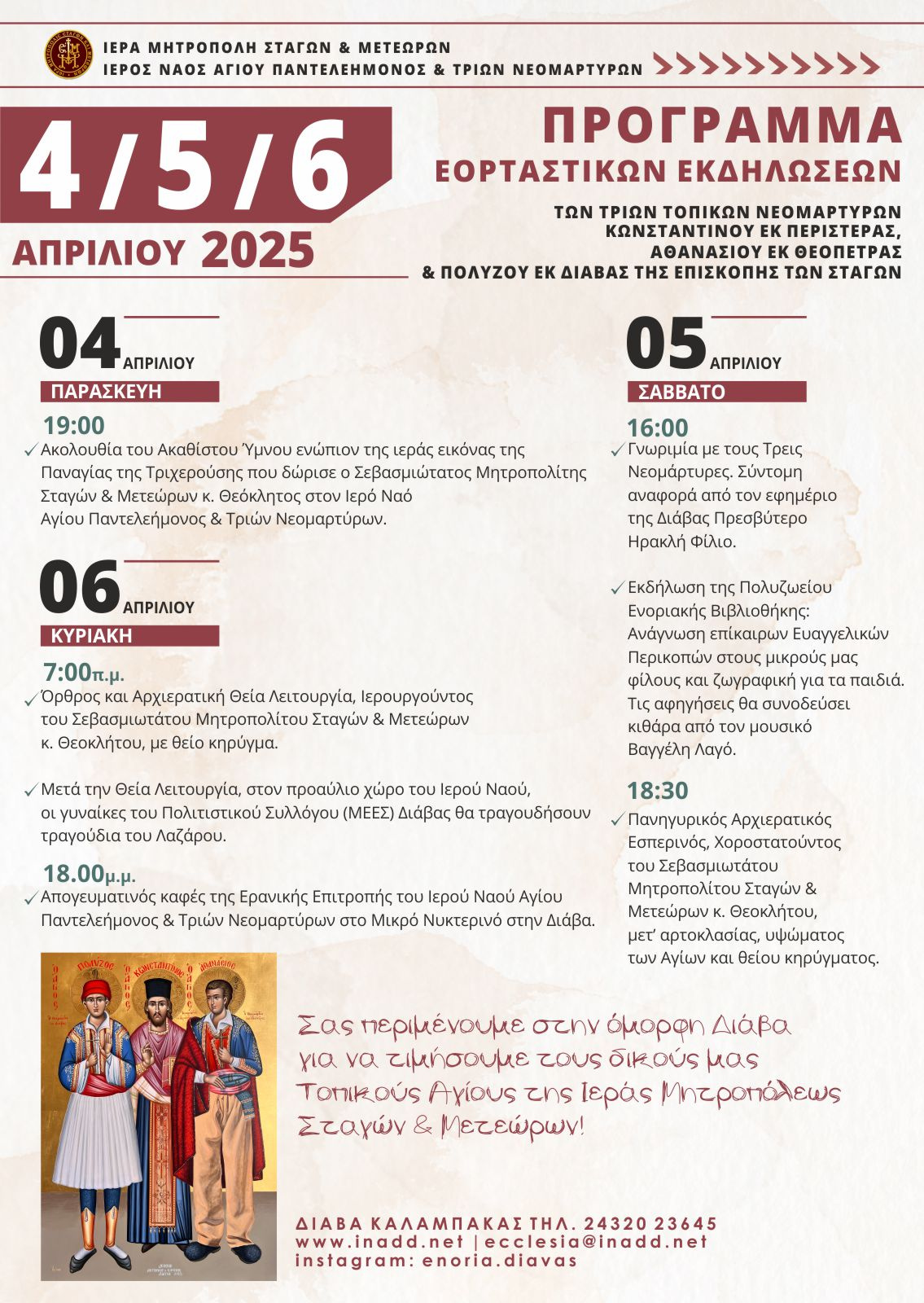 Με αισθήματα χαράς και τιμής, Σας προσκαλούμε στην Ιερά Πανήγυρη των Τριών Τοπικών Νεομαρτύρων της Επισκοπής των Σταγών στον Ιερό Ναό Αγίου Παντελεήμονος και Τριών Νεομαρτύρων Διάβας.