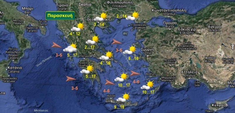 Την Παρασκευή, 31-1-2020 βελτιωμένος καιρός, εξασθένιση των ανέμων και σταδιακή άνοδος της θερμοκρασίας από την Παρασκευή και το Σαββατοκύριακο σε υψηλότερα από τα κανονικά επίπεδα. Αρκετή ηλιοφάνεια σ’ σχεδόν όλη τη χώρα, εξαίρεση με αυξημένη συννεφιά η δυτική Ελλάδα. Περιορισμένη ορατότητα και με ομίχλες αναμένονται τη νύχτα και το πρωί, με τοπικό παγετό στα ηπειρωτικά.