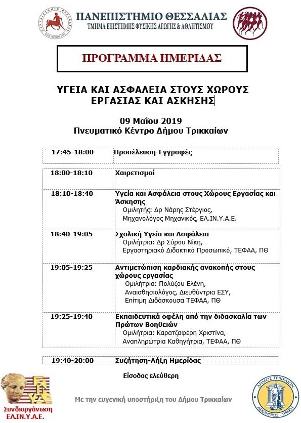Το Τμήμα Επιστήμης Φυσικής Αγωγής και Αθλητισμού (ΤΕΦΑΑ) του Πανεπιστημίου Θεσσαλίας σε συνεργασία με το “Ελληνικό Ινστιτούτο για την Υγεία και Ασφάλεια στην Εργασία” (ΕΛ.ΙΝ.Υ.Α .Ε.),διοργανώνουν ημερίδα με θέμα «Υγεία και Ασφάλεια στους Χώρους Εργασίας και Άσκησης» ,την Πέμπτη 09 Μαΐου 2019 και ώρα 18:00 μμ ,στην αίθουσα εκδηλώσεων του Πνευματικού Κέντρου του Δήμου Τρικκαίων.