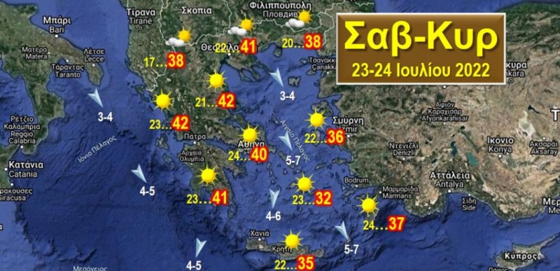 Άνεμοι: Βοριάδες, στα πελάγη μέτριοι 4-5, στο κεντρικό και νότιο Αιγαίο τοπικά ισχυροί 5-7 Μποφόρ. Θερμοκρασίες: Στα ηπειρωτικά από 18 έως 38-41 τοπικά έως και 42 βαθμούς, στα παραθαλάσσια και τα νησιά του Αιγαίου από 23 έως 33-35 τοπικά έως 36-37 βαθμούς.