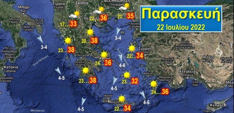 Άνεμοι: Βοριάδες, στα πελάγη μέτριοι 4-5, στο κεντρικό και νότιο Αιγαίο τοπικά ισχυροί 5-6 Μποφόρ. Θερμοκρασίες: Στα ηπειρωτικά από 17 έως 36-38, στα παραθαλάσσια και τα νησιά του Αιγαίου από 21 έως 33-35 βαθμούς.