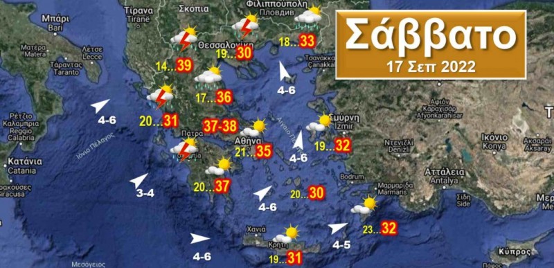Θερμοκρασίες: Στη βόρεια Ελλάδα από 13 έως 30, στη δυτική, κεντρική και νότια από 17 έως 31-34 στα ανατολικά έως 36-38 και τα νησιά από 18 έως 32 βαθμούς.