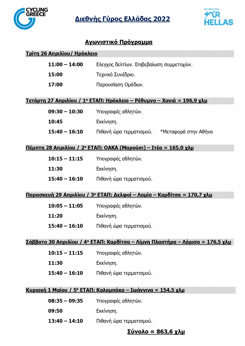 1ο Ηράκλειο –Ρέθυμνο- Χανιά, 2ο Αθηνα (ΟΑΚΑ) – Ιτέα, 3ο Δελφοί – Λαμία-Καρδίτσα, 4ο Καρδίτσα – Λίμνη Πλαστήρα-Λάρισα, 5ο Μετέωρα (Καλαμπάκα) – Ιωάννινα είναι οι συναρπαστικές διαδρομές που θα διατρέξει φέτος το λαμπερό πελοτόν.