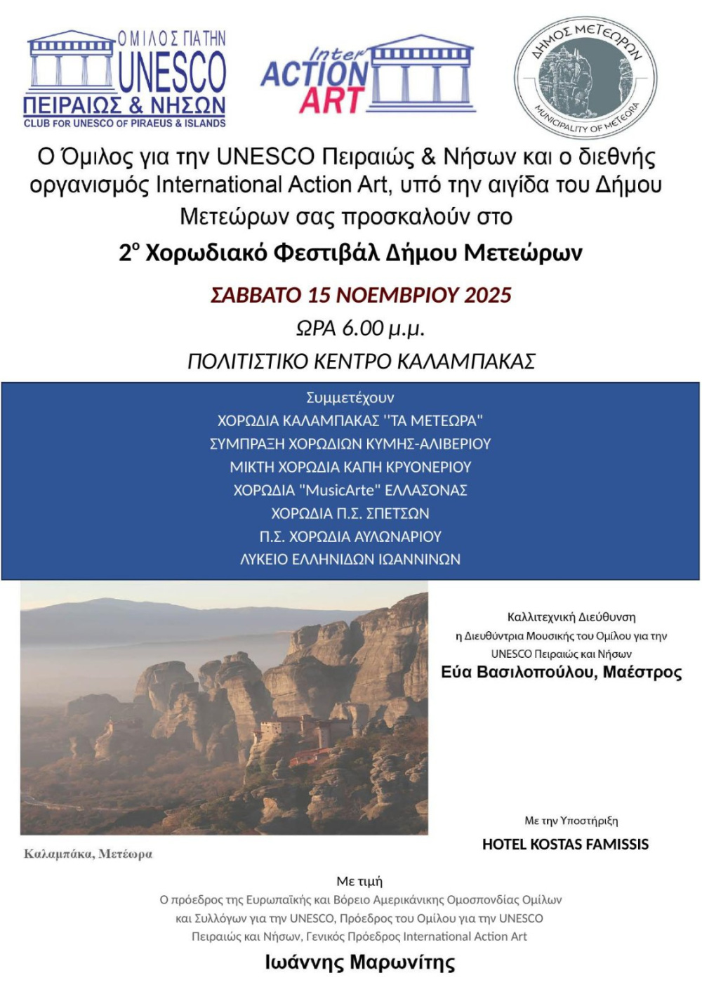 Ο Όμιλος για την UNESCO Πειραιώς & Νήσων και ο διεθνής οργανισμός International Action Art, υπό την αιγίδα του Δήμου Μετεώρων, διοργανώνουν το 2ο Χορωδιακό Φεστιβάλ Δήμου Μετεώρων, το Σάββατο 15 Νοεμβρίου 2025 και ώρα 6:00 μ.μ., στο Πολιτιστικό Κέντρο Καλαμπάκας.