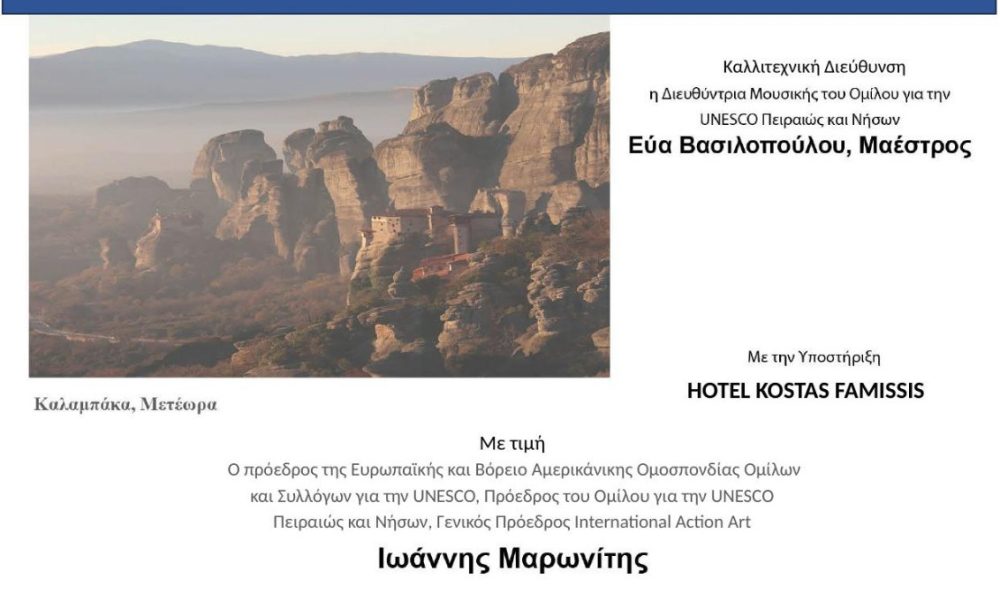 Ο Όμιλος για την UNESCO Πειραιώς & Νήσων και ο διεθνής οργανισμός International Action Art, υπό την αιγίδα του Δήμου Μετεώρων, διοργανώνουν το 2ο Χορωδιακό Φεστιβάλ Δήμου Μετεώρων, το Σάββατο 15 Νοεμβρίου 2025 και ώρα 6:00 μ.μ., στο Πολιτιστικό Κέντρο Καλαμπάκας.