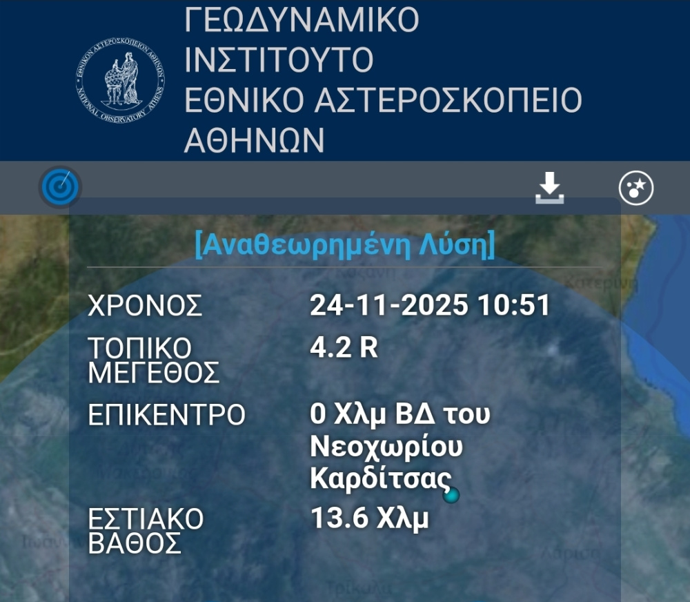 Σεισμός μεγέθους 4,2 Ρίχτερ σημειώθηκε στις 10.51 το πρωί της Δευτέρας (24/11) με το επίκεντρο να εντοπίζεται στην περιοχή της λίμνης Πλαστήρα.