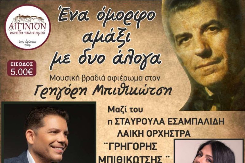 Μουσική βραδιά – αφιέρωμα στον Γρηγόρη Μπιθικώτση διοργανώνει ο Σύλλογος “ΑΙΓΙΝΙΟΝ Κοιτίδα Πολιτισμού” της Καλαμπάκας απόψε Σάββατο 21 Σεπτεμβρίου 2024 με τίτλο: “Ένα όμορφο αμάξι με δυο άλογα” στον αύλειο χώρο του ΚΕΓΕ στις 20:00 το βράδυ.