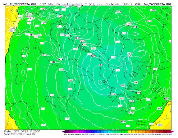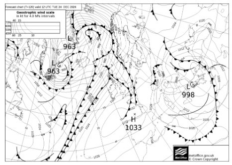 Θα προσπεράσουμε το Σκυριακό που εκτός από την πτώση της θερμοκρασίας και κάποιες λίγες βροχές από απόψε το βράδυ Παρασκευή 20 Δεκεμβρίου ως και τις πρωινές ώρες του Σαββάτου , και θα πάμε κατευθείαν στην Δευτέρα, μετά την δημιουργία του χαμηλού που όπως βλέπουμε στον χάρτη επιφανείας του UKMO θα βρίσκεται στο κεντρικό Ιόνιο.