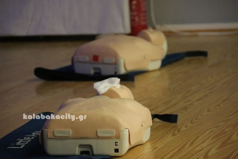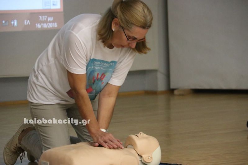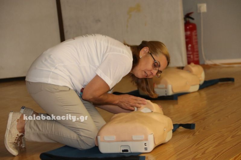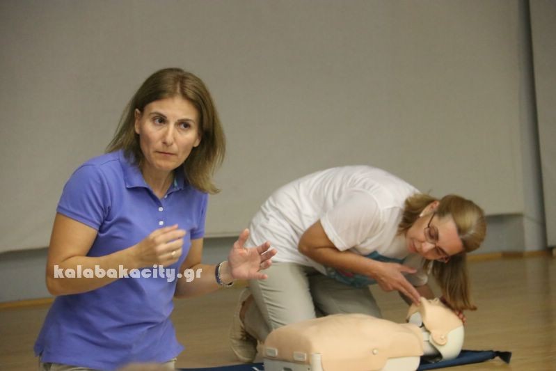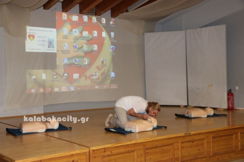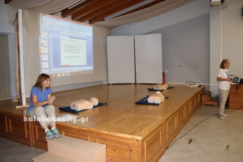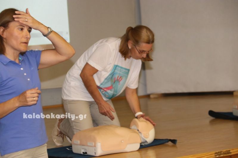 Η ιατρός αναισθησιολόγος κα Πολύζου με την δασκάλα – γυμνάστρια κα Σταμπολίδου έδειξαν στους παρευρισκόμενους τις κινήσεις που πρέπει να κάνουμε όταν βρεθούμε σε καρδιακό επεισόδιο συνανθρώπου μας