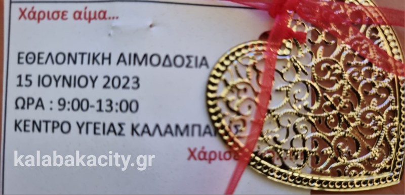 Επίσης, την Πέμπτη 15 Ιουνίου του 2023 και ώρα 8:30 – 13:30 στο χώρο του Κέντρου Υγείας Καλαμπάκας θα πραγματοποιηθεί «Εθελοντική Αιμοδοσία» σε συνεργασία με κλιμάκιο του Γενικού Νοσοκομείου Τρικάλων.