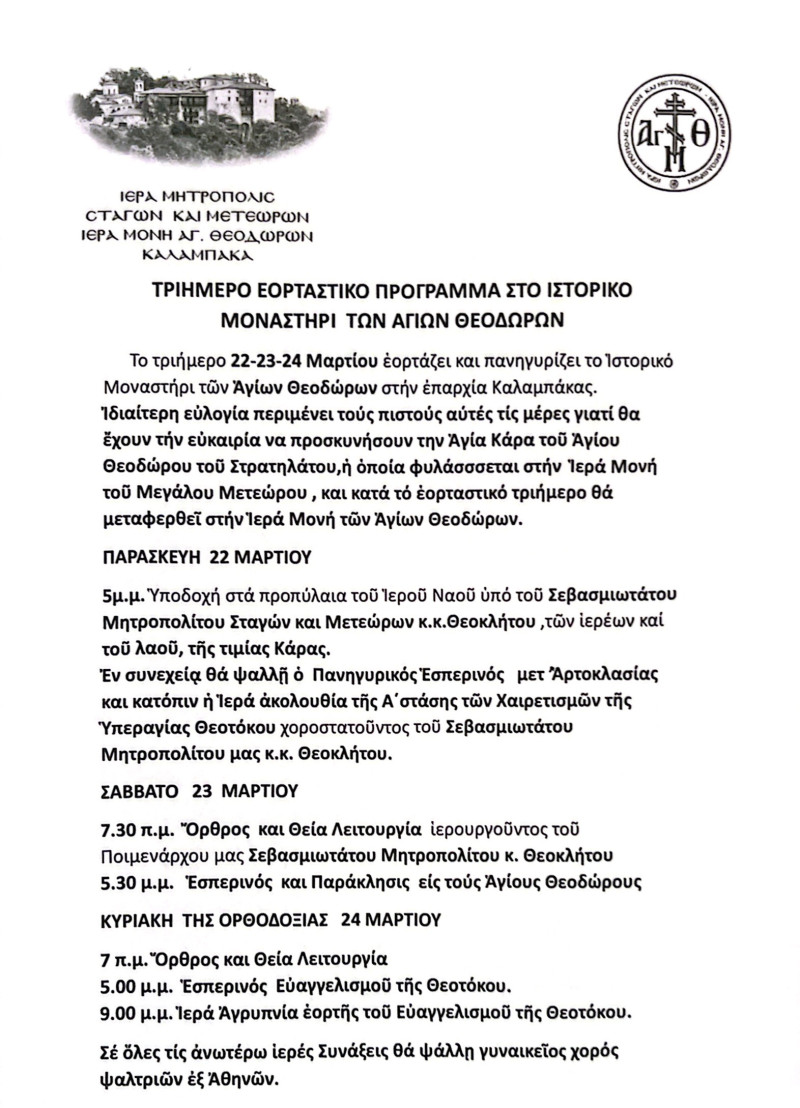 Το τριήμερο 22 – 23 – 42 Μαρτίου εορτάζει και πανηγυρίζει το Ιστορικό Μοναστήρι τῶν Ἁγίων Θεοδώρων στήν έπαρχία Καλαμπάκας. ιδιαίτερη εὐλογία περιμένει τούς πιστούς αυτές τίς μέρες γιατί θα ἔχουν τήν εὐκαιρία να προσκυνήσουν την Ἁγία Κάρα τοῦ Ἁγίου Θεοδώρου τοῦ Στρατηλάτου, ἡ ὁποία φυλάσσσεται στήν Ἱερά Μονή τοῦ Μεγάλου Μετεώρου, και κατά τό ἑορταστικό τριήμερο θά μεταφερθεῖ στήν Ἱερά Μονή τῶν Ἁγίων Θεοδώρων.