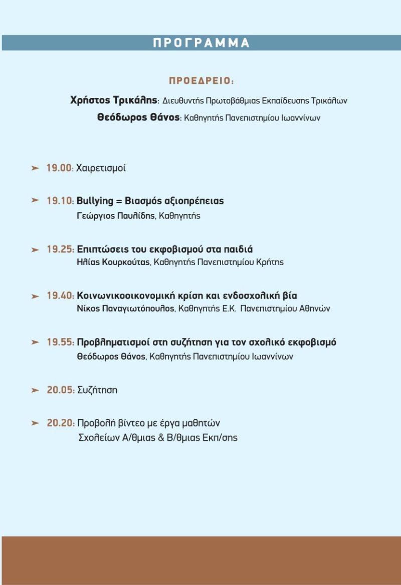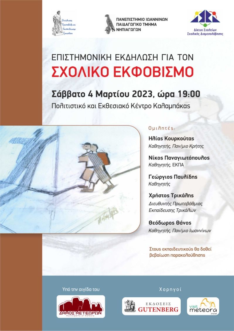 Στο πλαίσιο της παγκόσμιας ημέρας κατά του σχολικού εκφοβισμού (bullying),  στις 6 Μαρτίου, η Διεύθυνση Πρωτοβάθμιας Εκπαίδευσης Τρικάλων και το Παιδαγωγικό Τμήμα Νηπιαγωγών του Πανεπιστημίου Ιωαννίνων διοργανώνουν επιστημονική εκδήλωση με θέμα τον Σχολικό Εκφοβισμό (bullying) στο Πολιτιστικό και Εκθεσιακό Κέντρο της Καλαμπάκας το Σάββατο 4 Μαρτίου 2023 και ώρα 7 μμ.