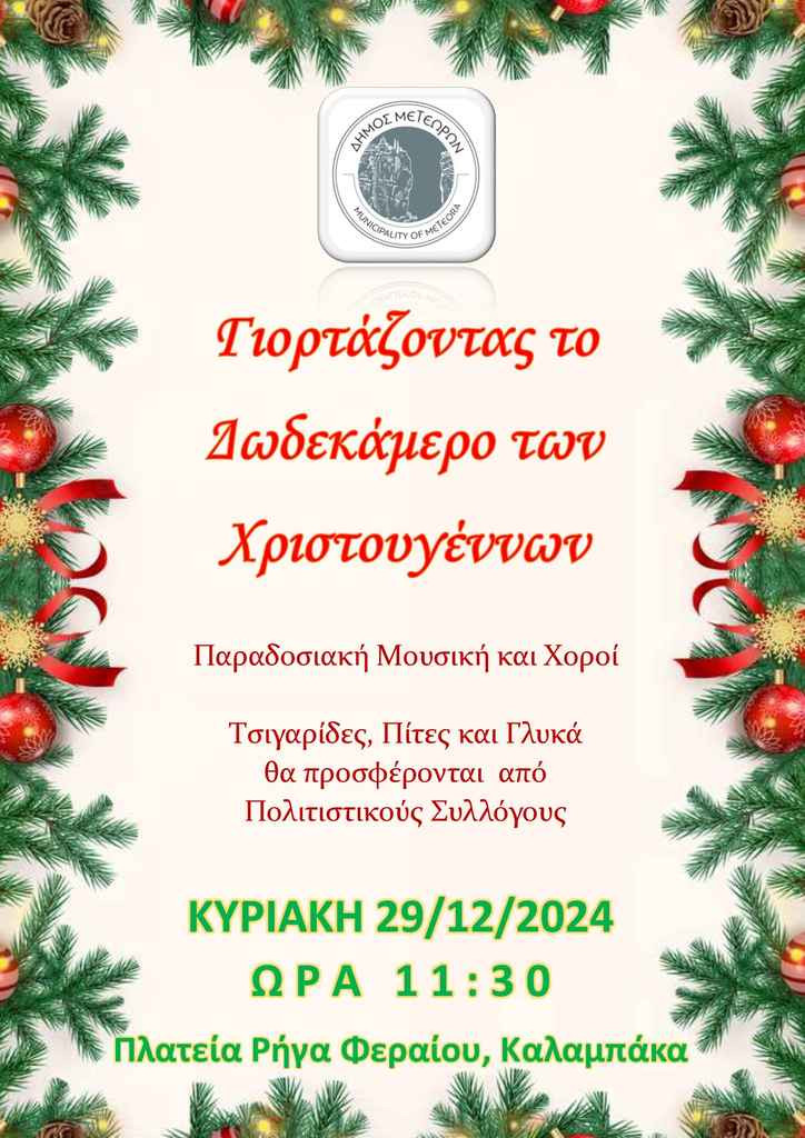Οι Χριστουγεννιάτικες εκδηλώσεις του Δήμου Μετεώρων συνεχίζονται αύριο στην Πλατεία Δημαρχείου με παραδοσιακή μουσική και χορούς από τους συλλόγους «Μετεώρων Παρέα» και «Απειρωτάν».