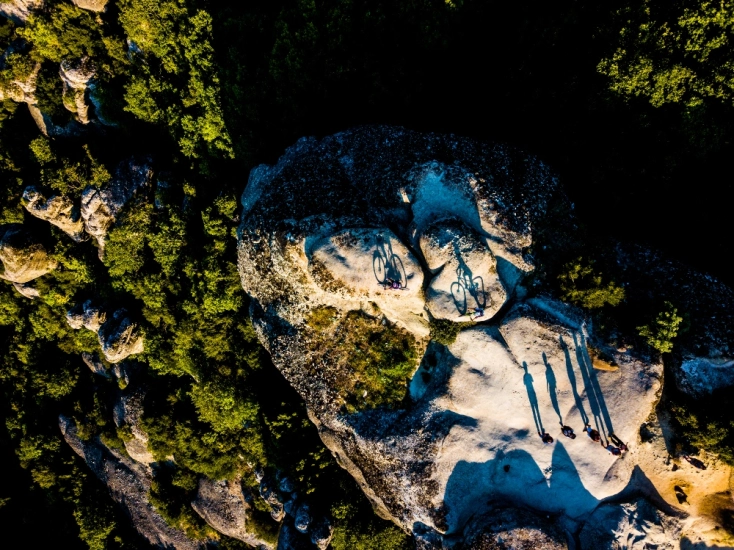 Η μοναχική περιήγηση στην πόλη μοιάζει σιωπηλή εξομολόγηση, με μετρημένες λέξεις. Ακολουθώ με γρήγορο βηματισμό κάποιους δρομείς που απολαμβάνουν τη διαδρομή του μαραθωνίου με τα πολλά ζιγκ-ζαγκ μέσα και γύρω από την πόλη και ανάμεσα στις βραχώδεις στήλες των Μετεώρων που στέκουν θεατές, κριτές και ανταγωνιστές μάλλον. Δύο ποδηλάτες στέκονται στην άκρη του κενού. Οι μεγάλες σκιές τους και οι πέντε σκιές των θεατών σχεδιάζουν το γκρι των βράχων που κρατάνε όλο το Αγιολόγιο στις πλάτες τους.