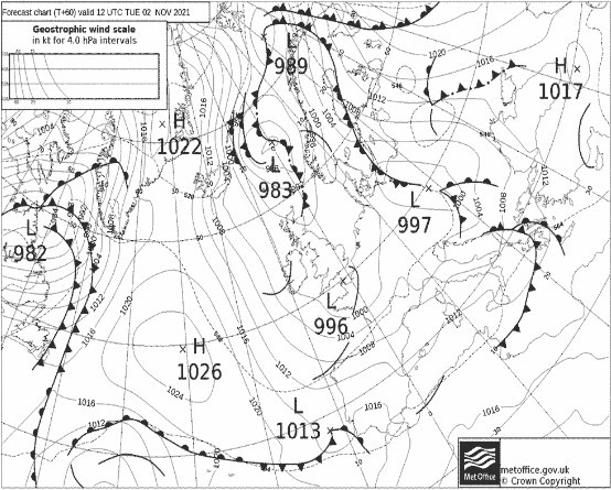Τώρα αν θέλουμε να πάμε στον Νοέμβρη που ξεκινά αύριο , μετά το πέρασμα ενός μετώπου την Τρίτη το πρωί 2 Νοεμβρίου όπως βλέπουμε στον παρακάτω χάρτη επιφανείας του UKMO