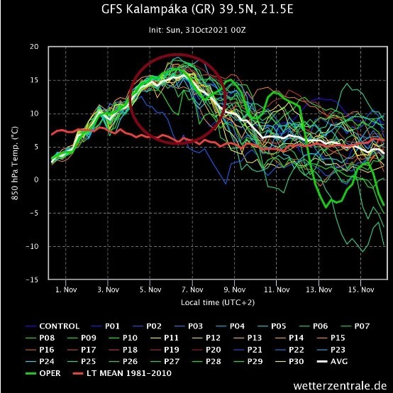 θα φτάσουμε σε ένα μέγιστο θερμοκρασιακών τιμών στις 5 με 7 Νοεμβρίου ως και 10 βαθμούς πάνω από τις κλιματικές τιμές για την εποχή στα 850 hpa περίπου στα 1500 μέτρα υψόμετρο που μεταφράζοντας αυτό για την περιοχή μας και όχι μόνο να δούμε θερμοκρασίες ως και 25 βαθμούς κελσίου!! Αυτό θα το δούμε αν γίνει , αν και πόσο βοηθήσουν οι δυτικοί άνεμοι ου κατερχόμενοι από την Πίνδο θα ξεραίνονται με αποτέλεσμα να ανεβάζουν την θερμοκρασία. Μέχρι και τις 11 Νοεμβρίου δεν δείχνει να αλλάζει κάτι παρά μόνο μια σταδιακή μικρή πτώση της θερμοκρασίας από τις 8 Νοεμβρίου και μετά.