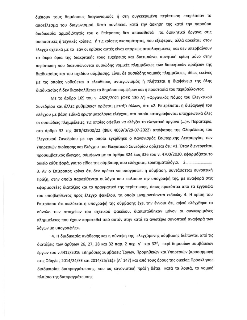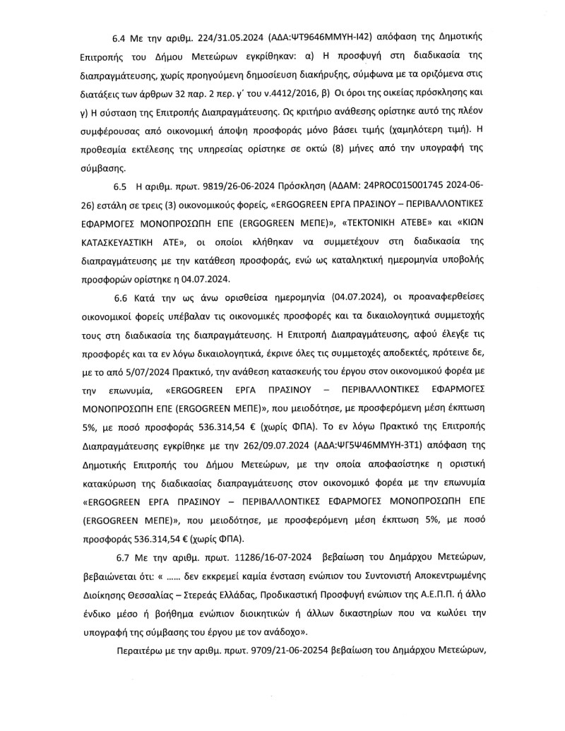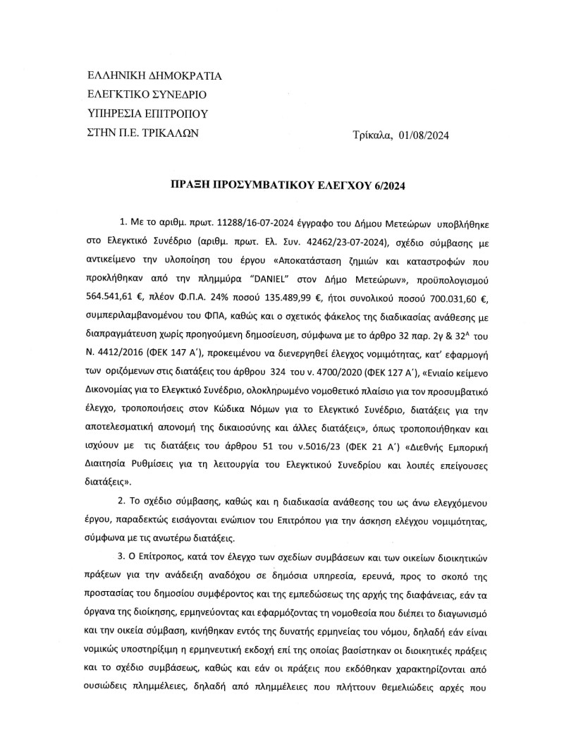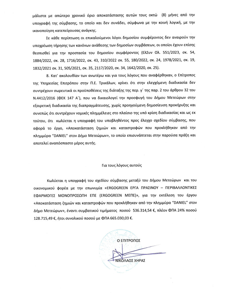 Κωλύεται η υπογραφή του σχεδίου σύμβασης μεταξύ του Δήμου Μετεώρων και του οικονομικού φορέα με την επωνυμία «ERGOGREEN ΕΡΓΑ ΠΡΑΣΙΝΟΥ ΠΕΡΙΒΑΛΛΟΝΤΙΚΕΣ ΕΦΑΡΜΟΓΕΣ ΜΟΝΟΠΡΟΣΩΠΗ ΕΠΕ (ERGOGREEN ΜΕΠΕ)», για την εκτέλεση του έργου «Αποκατάσταση ζημιών και καταστροφών που προκλήθηκαν από την πλημμύρα “DANIEL” στον Δήμο Μετεώρων», έναντι συμβατικού τιμήματος ποσού 536.314,54 €, πλέον ΦΠΑ 24% ποσού 128.715,49 €, ήτοι συνολικού ποσού με ΦΠΑ 665.030,03 € σύμφωνα με απόφαση του Επιτρόπου κ. Χήρα.