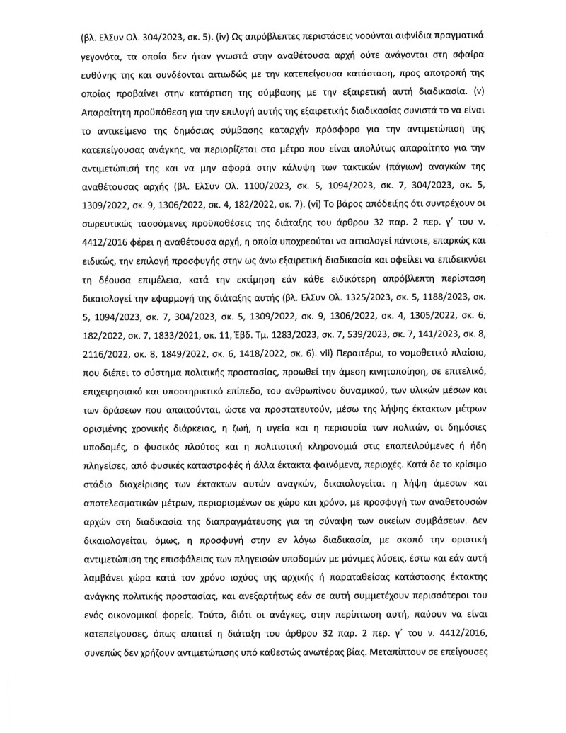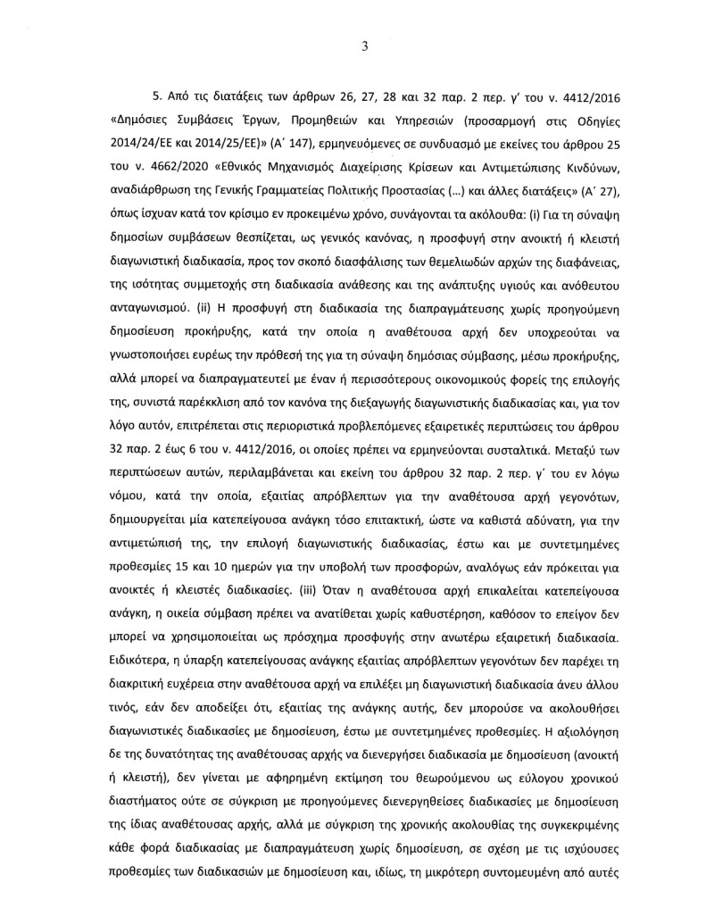 Σε κάθε περίπτωση οι επικαλούμενοι λόγοι δημοσίου συμφέροντος δεν αναιρούν την υποχρέωση τήρησης των κανόνων ανάθεσης των δημοσίων συμβάσεων, οι οποίοι έχουν επίσης θεσπισθεί για την προστασία του δημοσίου συμφέροντος (ΕλΣυν Ολ. 551/2023, σκ. 54, 1884/2022, ok. 28, 1716/2022, σк. 43, 310/2022 ok. 55, 180/2022, ok. 24, 1978/2021, ok. 19, 1832/2021 ok. 31, 505/2021, OK. 35, 2117/2020, ok. 34, 1642/2020, ok. 25).