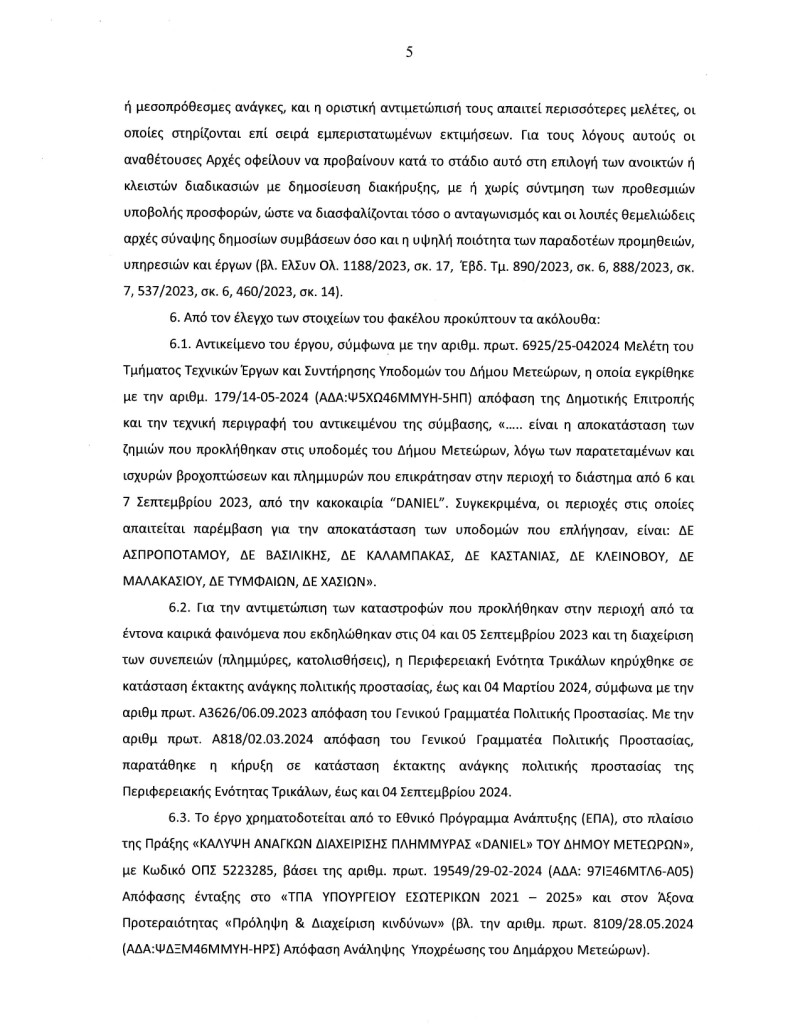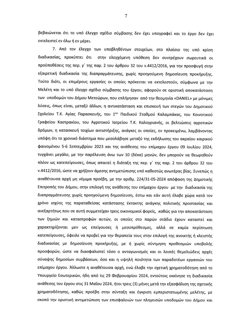 Τούτο διότι, οι επιμέρους εργασίες οι οποίες πρόκειται να εκτελεστούν, σύμφωνα με την Μελέτη και το υπό έλεγχο σχέδιο σύμβασης του έργου, αφορούν σε οριστική αποκατάσταση των υποδομών του Δήμου Μετεώρων, που επλήγησαν από την θεομηνία «DANIEL» με μόνιμες λύσεις, όπως είναι, μεταξύ άλλων, η αντικατάσταση και επισκευή των στεγών του Δημοτικού Σχολείου Τ.Κ. Αγίας Παρασκευής, του 1ου Παιδικού Σταθμού Καλαμπάκας, του Κοινοτικού Γραφείου Καστρακίου, του Αγροτικού Ιατρείου Τ.Κ. Καλογριανής, οι βελτιώσεις αγροτικών δρόμων, η κατασκευή τοιχίων αντιστήριξης, ανάγκες οι οποίες, εν προκειμένω, λαμβάνοντας υπόψη ότι το χρονικό διάστημα που μεσολάβησε μεταξύ της εκδήλωσης του ακραίου καιρικού φαινομένου 5-6 Σεπτεμβρίου 2023 και της ανάθεσης του επίμαχου έργου 09 Ιουλίου 2024, τυγχάνει μεγάλο, με την παρέλευση άνω των 10 (δέκα) μηνών, δεν μπορούν να θεωρηθούν πλέον ως κατεπείγουσες, όπως απαιτεί η διάταξη της περ. γ ́ της παρ. 2 του άρθρου 32 του ν.4412/2016, ώστε να χρήζουν άμεσης αντιμετώπισης υπό καθεστώς ανωτέρας βίας.