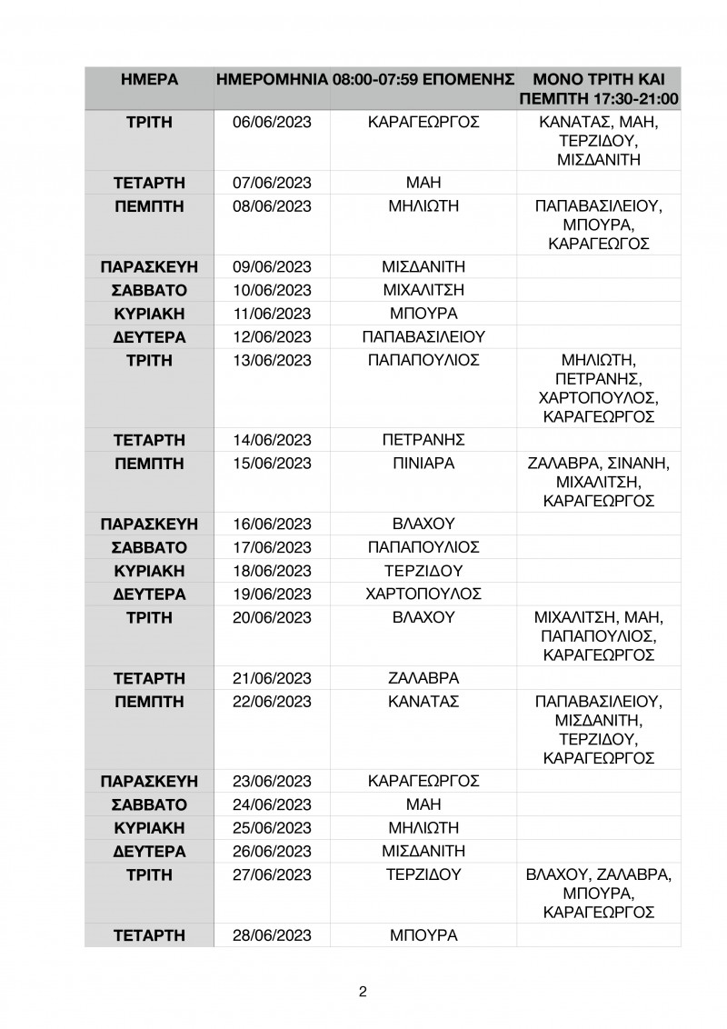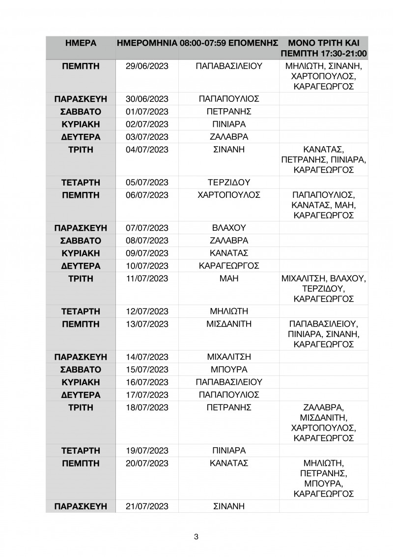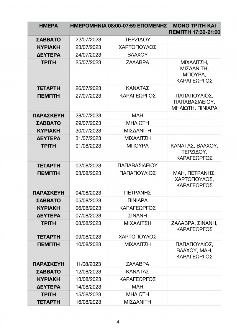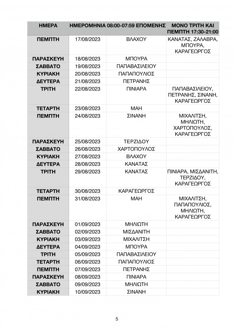 Το πρόγραμμα των εφημεριών έως τις 10 Σεπτεμβρίου έχει ως εξής: