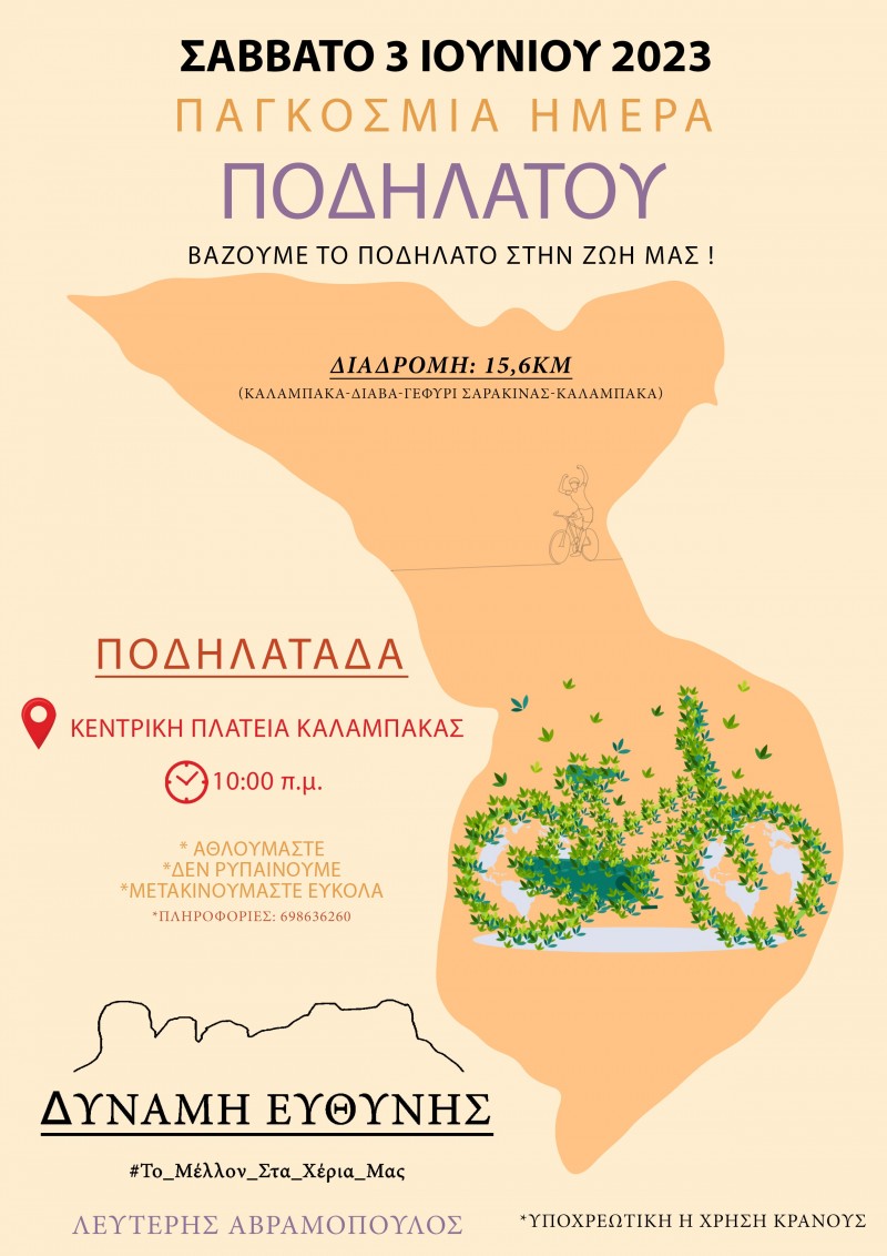 Αυτό το Σάββατο στις 10 το πρωί παίρνουμε τα ποδήλατά μας, φοράμε κράνος και δίνουμε ραντεβού στην κεντρική πλατεία της Καλαμπάκας. Από εκεί ξεκινάμε την ποδηλατοβόλτα μας, φτάνουμε Διάβα, γεφύρι Σαρακίνας και επιστρέφουμε στην πόλη μας.