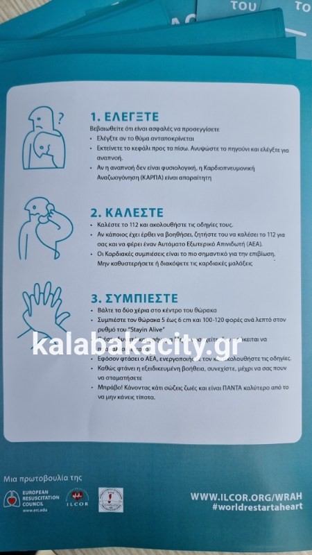 Εκδήλωση πραγματοποιήθηκε σήμερα στην κεντρική πλατεία Ρήγα Φεραίου Καλαμπάκας με αφορμή την Παγκόσμια Ημέρα Επανεκκίνησης Καρδιάς ( World Restart a Heart Day), η οποία έχει ορισθεί από το 2012 από το Ευρωπαϊκό Κοινοβούλιο με γνώμονα το μήνυμα « όλοι οι πολίτες του κόσμου μπορούν να σώσουν μια ζωή».