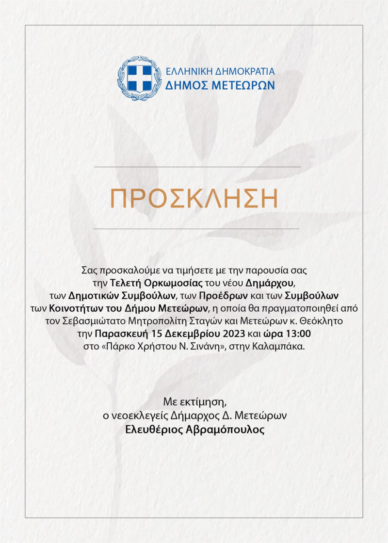 Σας προσκαλούμε να τιμήσετε με την παρουσία σας την Τελετή Ορκωμοσίας του νέου Δημάρχου, των Δημοτικών Συμβούλων, των Προέδρων και των Συμβούλων των Κοινοτήτων του Δήμου Μετεώρων, η οποία θα πραγματοποιηθεί από τον Σεβασμιώτατο Μητροπολίτη Σταγών και Μετεώρων κ. Θεόκλητο την Παρασκευή 15 Δεκεμβρίου 2023 και ώρα 13:00 στο «Πάρκο Χρήστου Ν. Σινάνη», στην Καλαμπάκα.