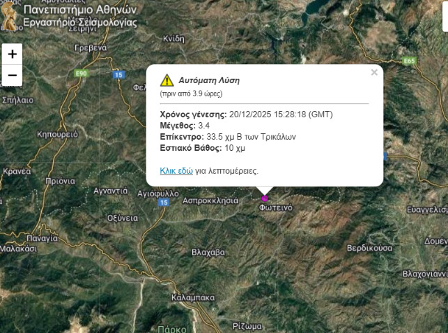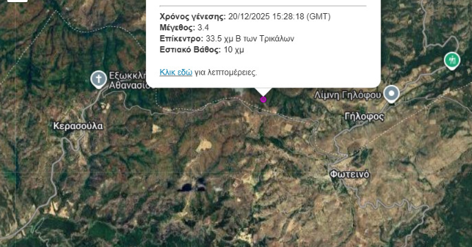 Σεισμική δόνηση σημειώθηκε το μεσημέρι του Σαββάτου στις 15:28 σύμφωνα με Εργαστήρι Σεισμολογίας του Πανεπιστημίου Αθηνών στην περιοχή του Γήλοφου με Δεσκάτη.