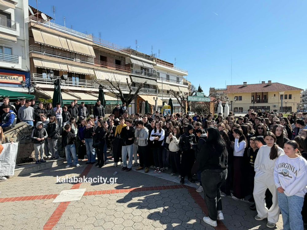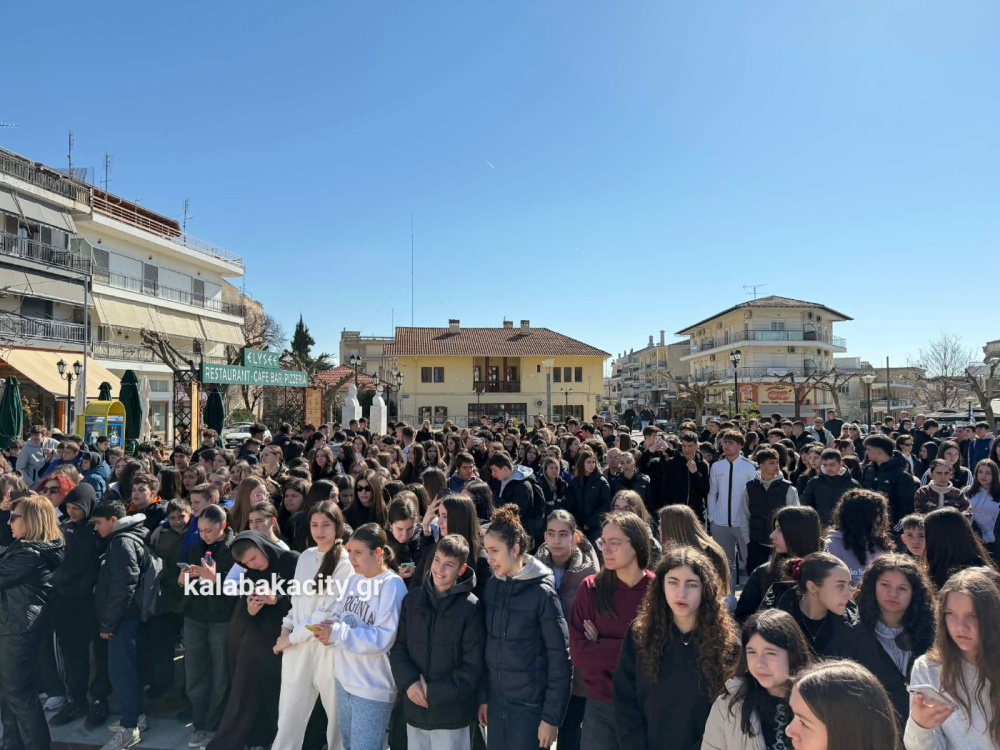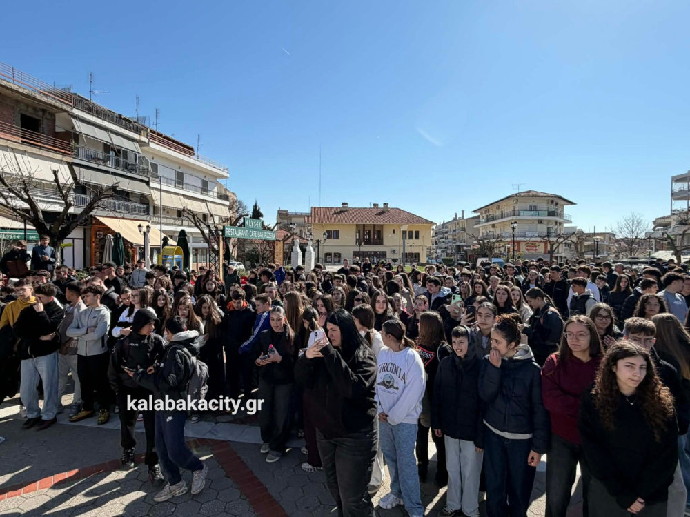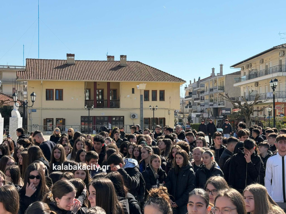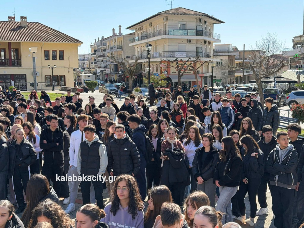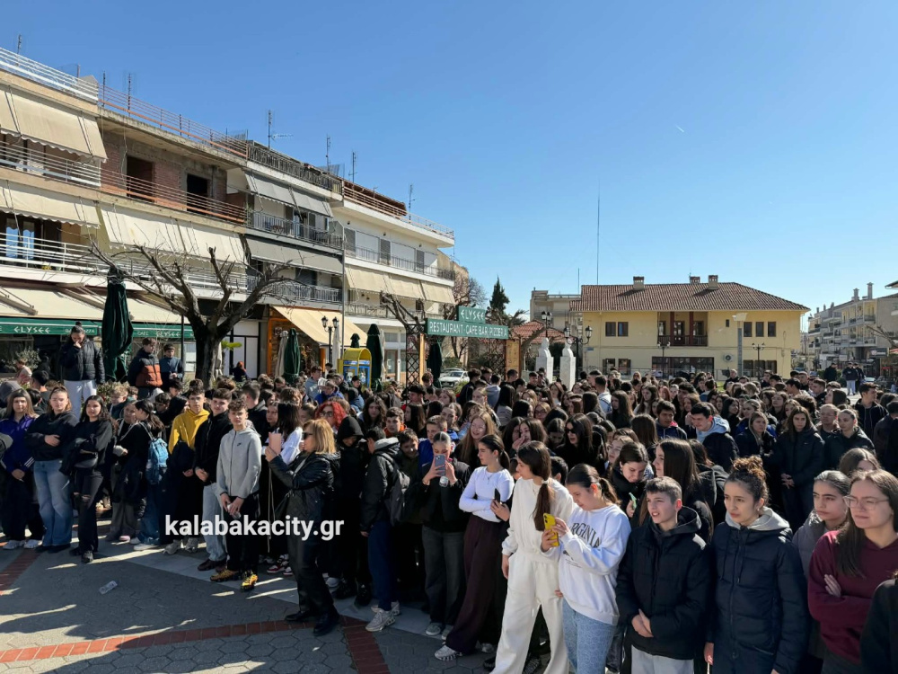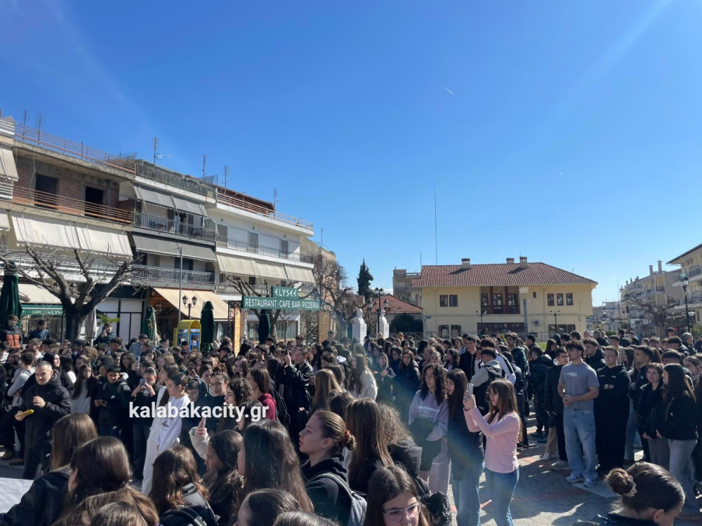 Στην πλατεία Πλατεία Ρήγα Φεραίου συγκεντρώθηκαν μαθητές από γυμνάσια και λύκεια της Καλαμπάκα, τιμώντας τη μνήμη των θυμάτων της τραγωδίας στο Σιδηροδρομικό δυστύχημα των Τεμπών