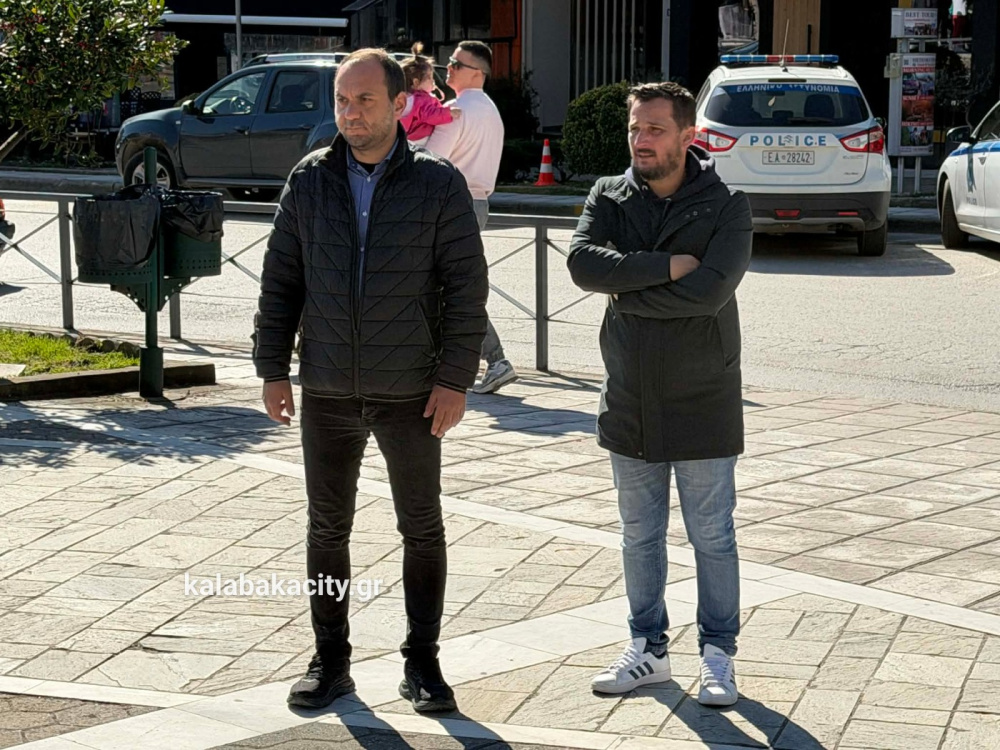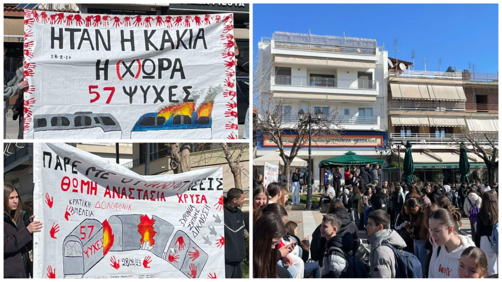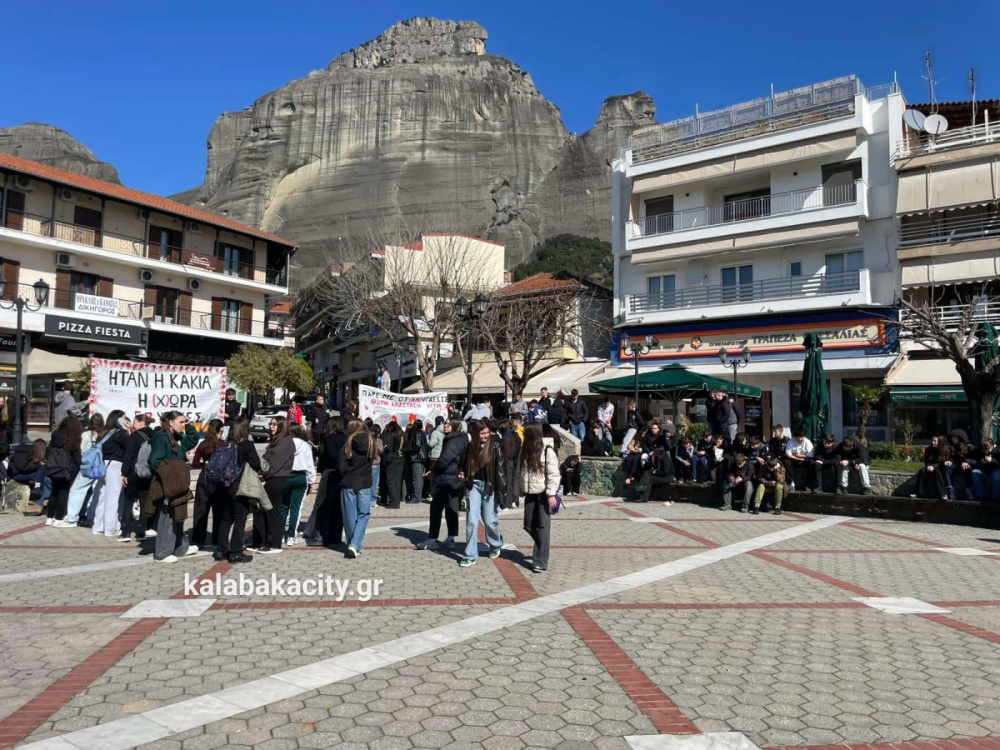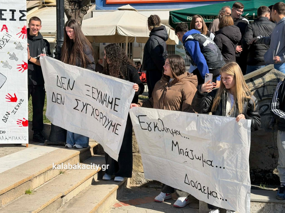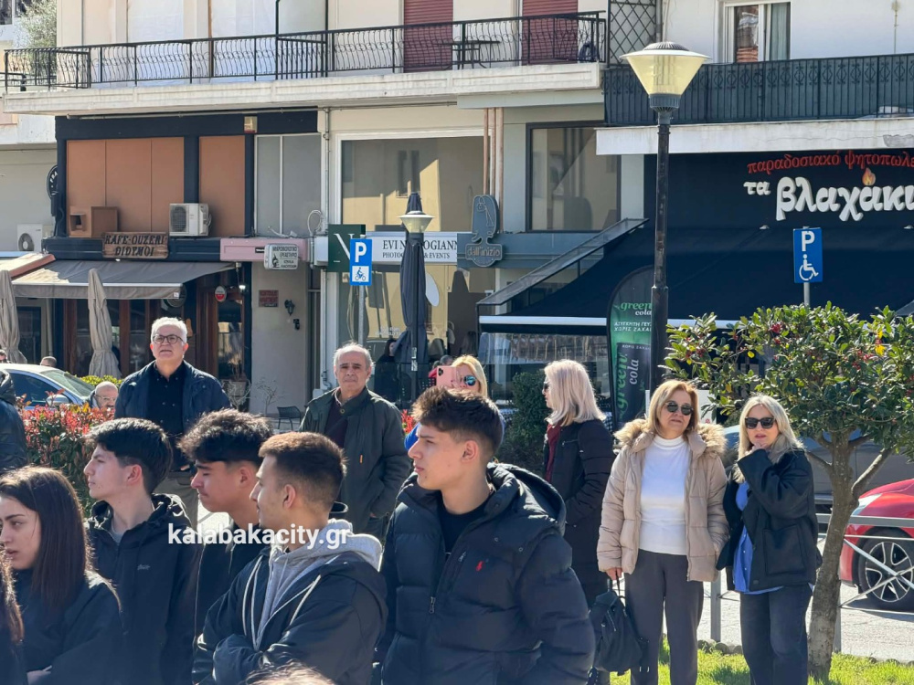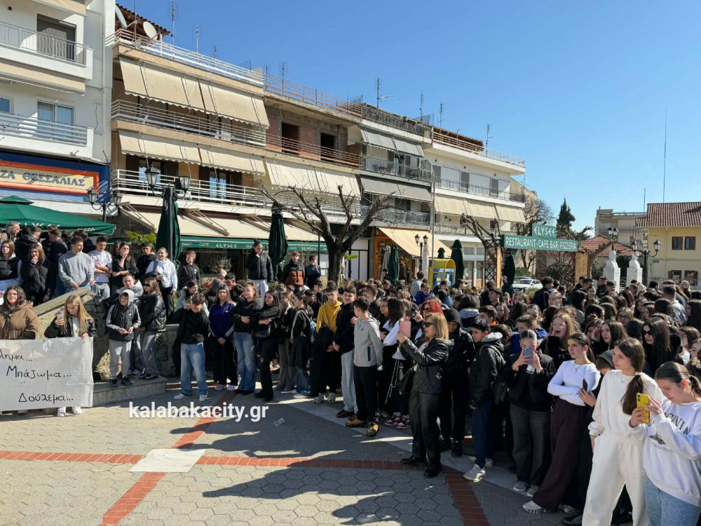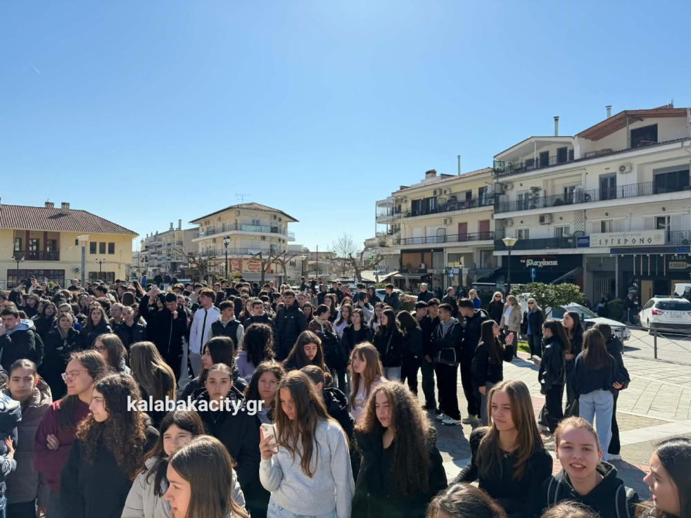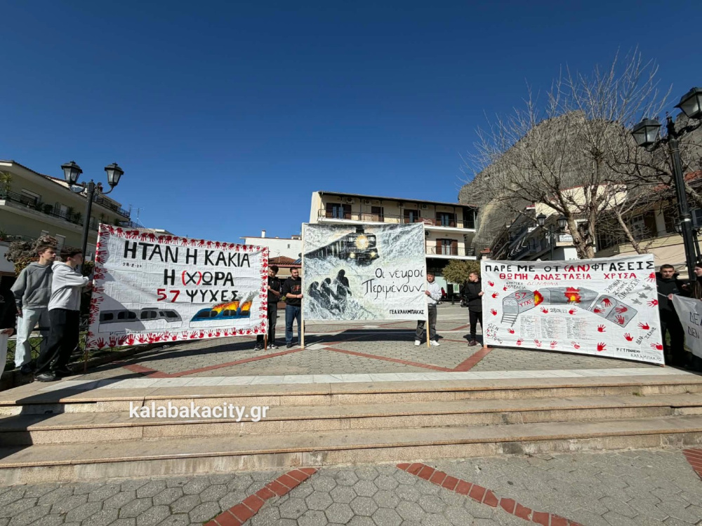 Στην πλατεία Πλατεία Ρήγα Φεραίου συγκεντρώθηκαν μαθητές από γυμνάσια και λύκεια της Καλαμπάκα, τιμώντας τη μνήμη των θυμάτων της τραγωδίας στο Σιδηροδρομικό δυστύχημα των Τεμπών