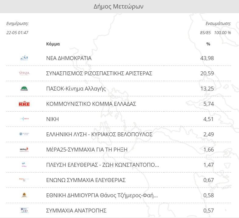 Ο Δήμος Μετεώρων έδωσε 43, 98% στη Ν.Δ. σύμφωνα με τα αποτελέσματα των 85 εκλογικών τμημάτων τμημάτων.