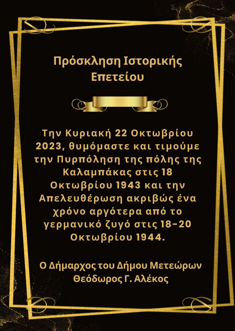 Την Κυριακή 22 Οκτωβρίου 2023, θυμόμαστε και τιμούμε την Πυρπόληση της πόλης της Καλαμπάκας στις 18 Οκτωβρίου 1943 και την Απελευθέρωση ακριβώς ένα χρόνο αργότερα από το γερμανικό ζυγό στις 18-20 Οκτωβρίου 1944.
