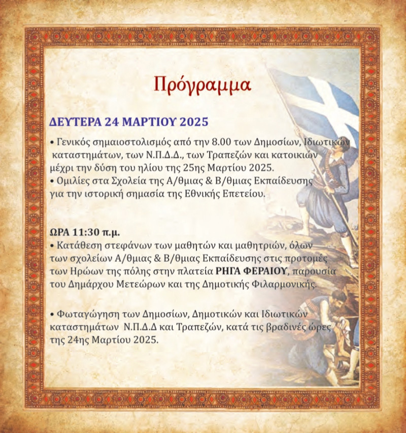 Καλαμπάκα: Το πρόγραμμα εορτασμού της 25ης Μαρτίου Τοπικές Ειδήσεις Από admin Δημοσίευση Μαρ 19, 2025 -12:25 0 599 Κοινοποίηση FacebookTwitterΗλεκτρονικό ΤαχυδρομείοViber Ο Δήμαρχος Μετεώρων σας προσκαλεί στις εορταστικές εκδηλώσεις για την επέτειο της 25ης Μαρτίου 1821. Ο Δήμαρχος Μετεώρων ΕΛΕΥΘΕΡΙΟΣ Ν. ΑΒΡΑΜΟΠΟΥΛΟΣ 0 599 Κοινοποίηση