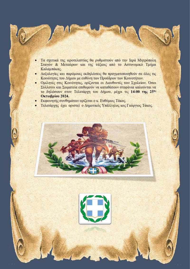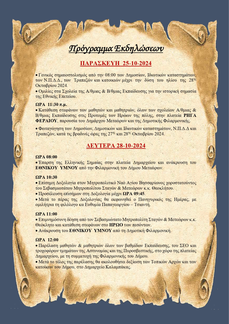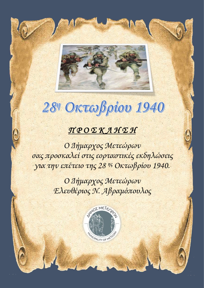 Ο Δήμαρχος Μετεώρων σας προσκαλεί στις εορταστικές εκδηλώσεις για την επέτειο της 28 ης Οκτωβρίου 1940.