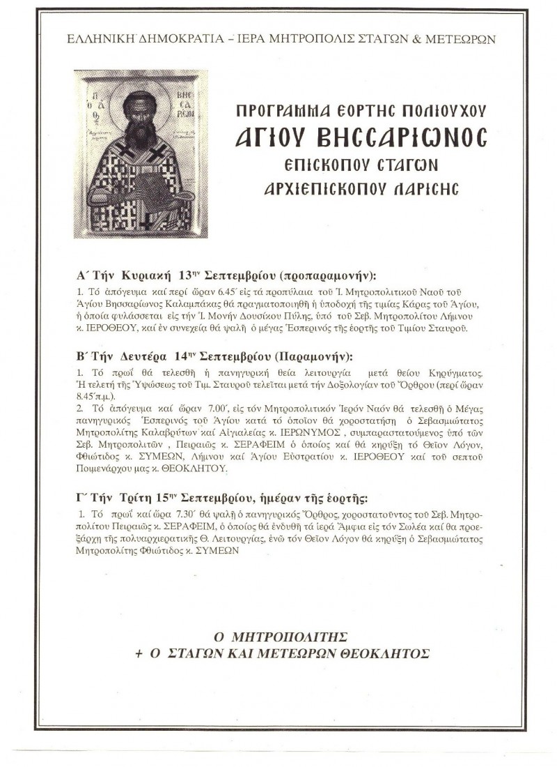 Καλαμπάκα: Το πρόγραμμα εορτασμού του Πολιούχου Αγίου Βησσαρίωνος Ανακοινώσεις Από admin Δημοσίευση Σεπ 9, 2020 -11:48 0 411 Κοινοποίηση FacebookTwitterΗλεκτρονικό ΤαχυδρομείοViber Απο την Ιερά Μητρόπολη Σταγών και Μετεώρων ανακοινώθηκε το πρόγραμμα εορτασμού του Πολιούχου Αγίου Βησσαρίωνος. 0 411 Κοινοποίηση