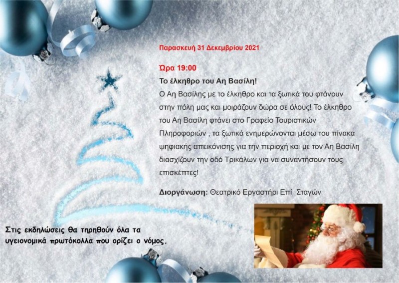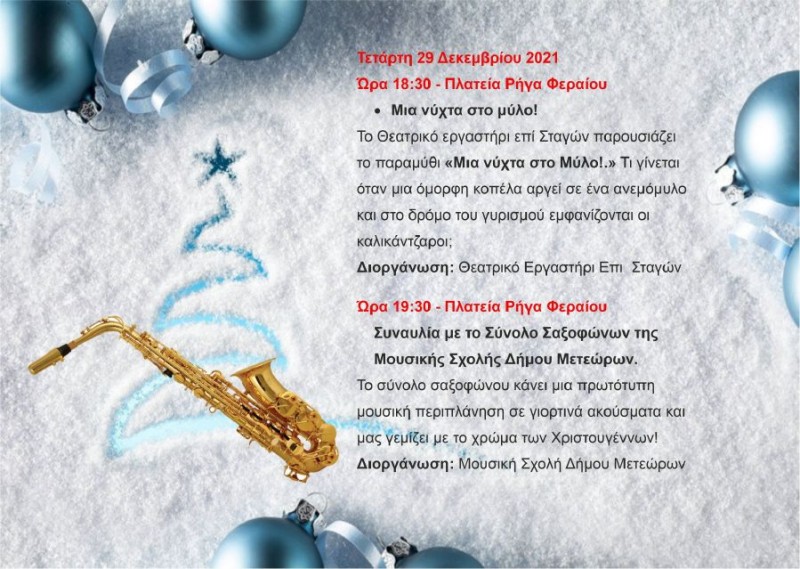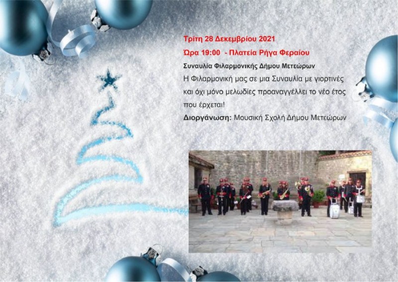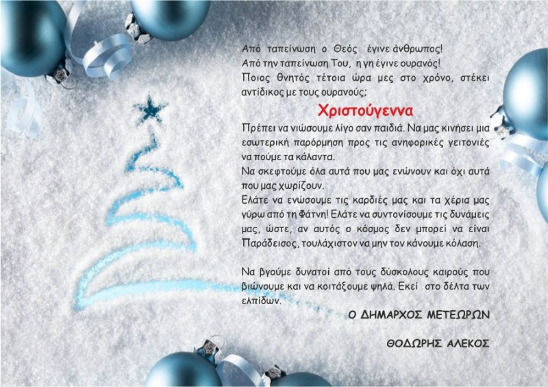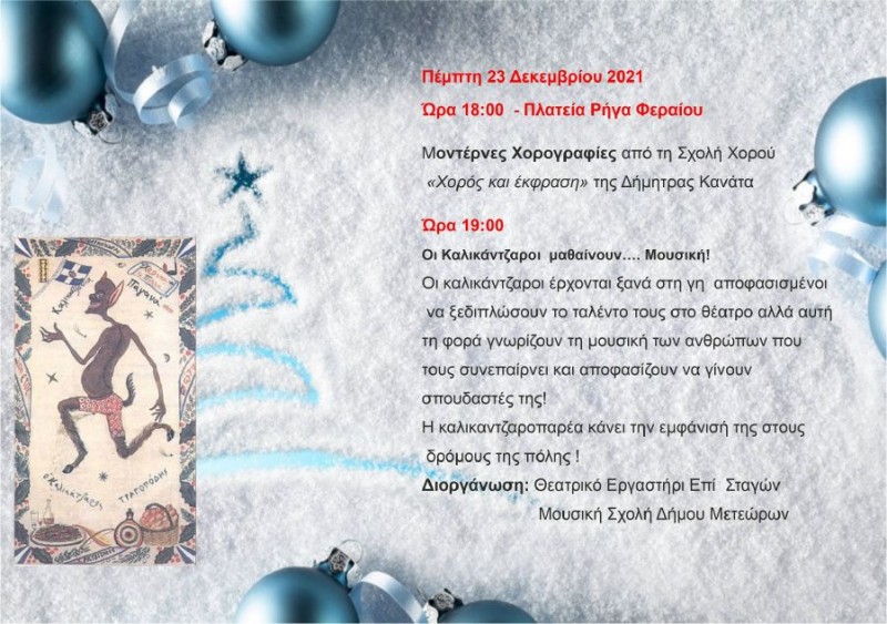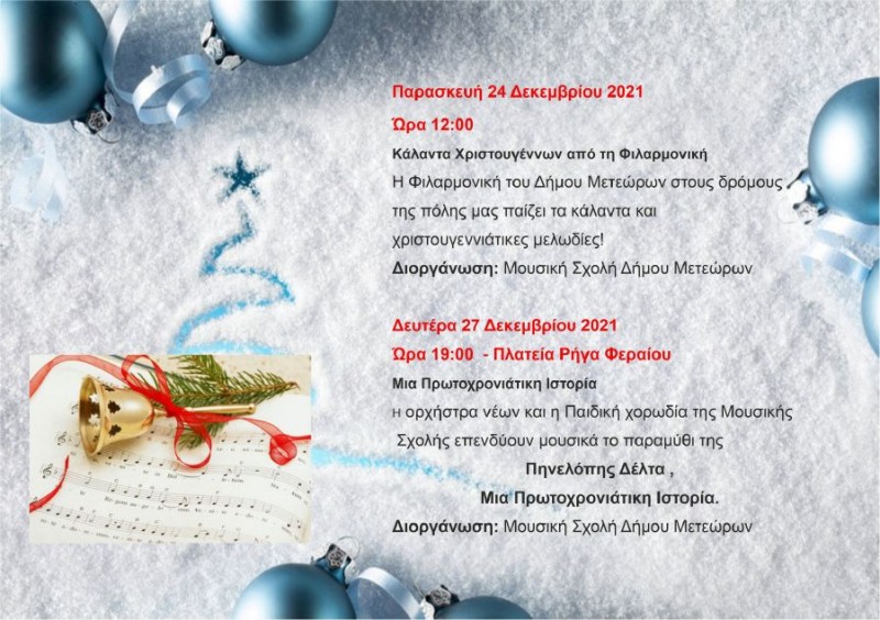 Το Πρόγραμμα των Χριστουγεννιάτικων εκδηλώσεων ανακοίνωσε ο Δήμος Μετεώρων.