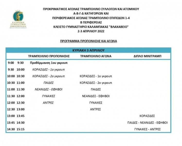 Να θυμίσουμε πως το διήμερο 1 – 2 Απριλίου διεξάγονται στην Καλαμπάκα οι ΠΡΟΚΡΙΜΑΤΙΚΟΙ ΑΓΩΝΕΣ ΤΡΑΜΠΟΛΙΝΟ ΣΥΛΛΟΓΩΝ ΚΑΙ ΑΤΟΜΙΚΟΥ Α-Β-Γ-Δ ΚΑΤΗΓΟΡΙΩΝ ΚΑΙ ΠΕΡΙΦΕΡΕΙΑΚΟΥ ΑΓΩΝΑ ΤΡΑΜΠΟΛΙΝΟ ΕΠΙΠΕΔΩΝ 1-4 Β ΠΕΡΙΦΕΡΕΙΑΣ