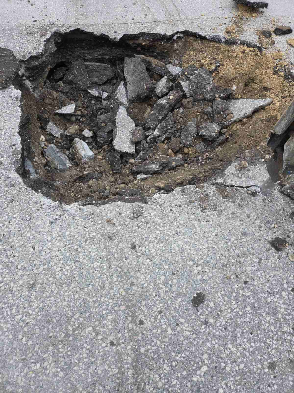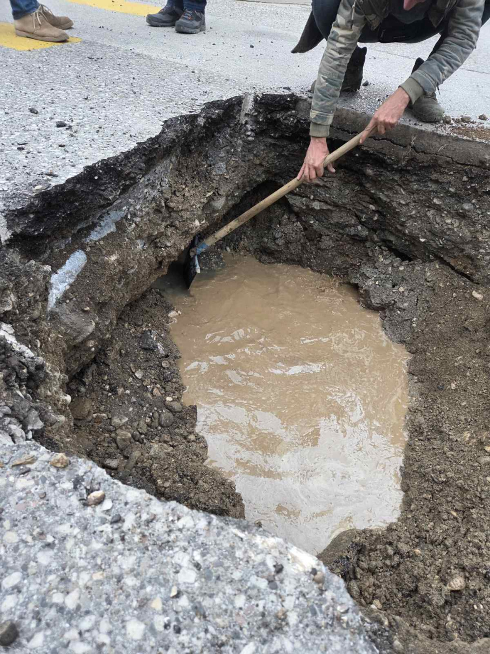 Με το άνοιγμα περαιτέρω του οδοστρώματος για την αποκατάσταση αποκαλύφθηκε και ο λόγος της καθίζησης που είναι το σπάσιμο αγωγού που βρίσκεται στο σημείο!