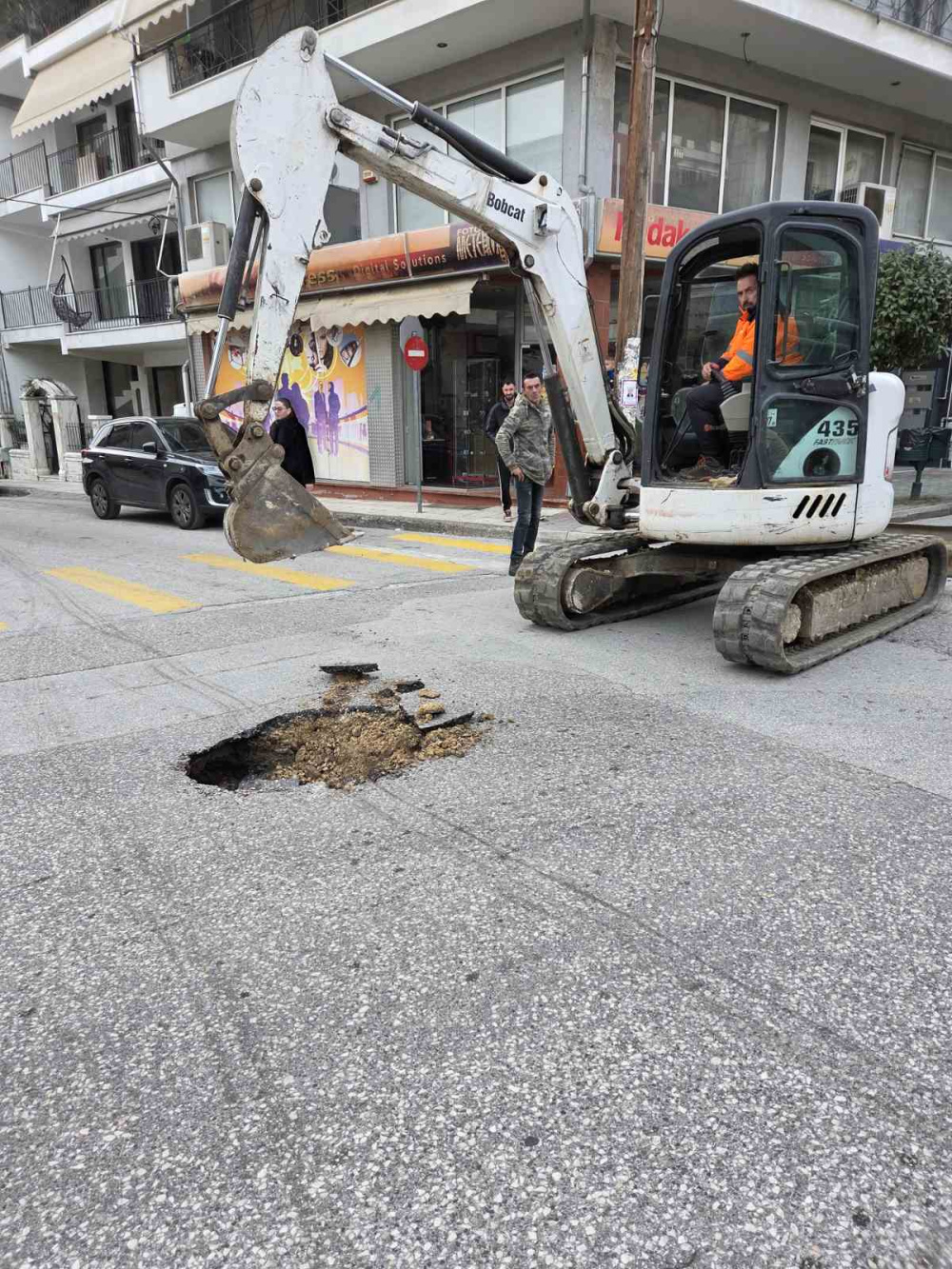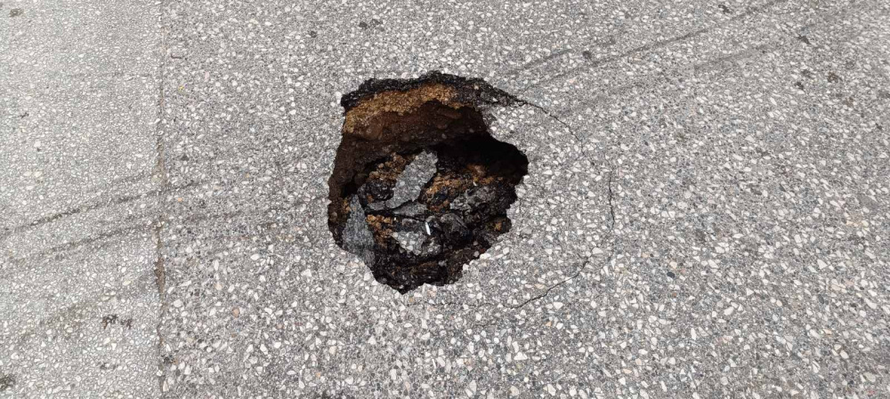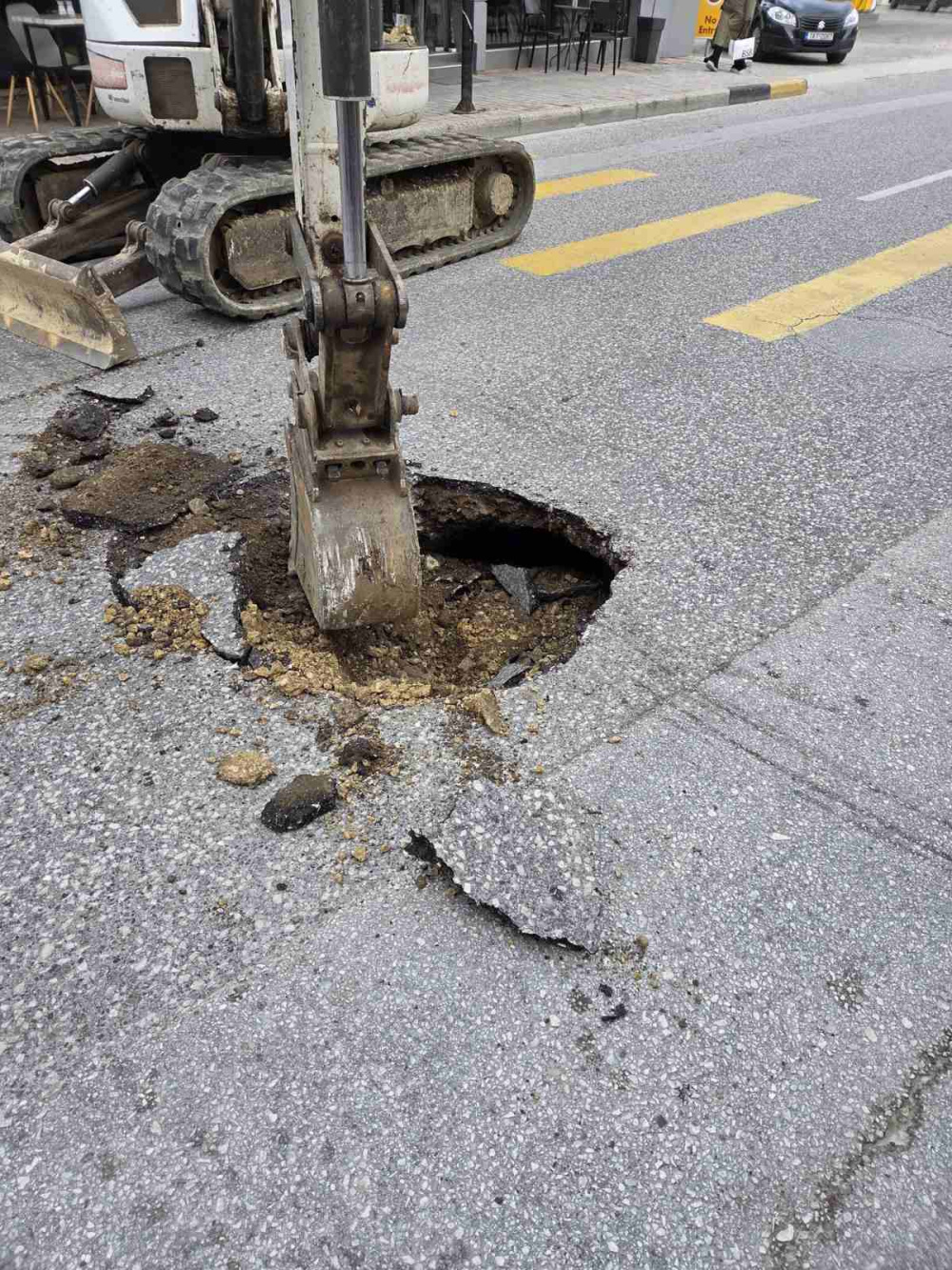 Με το άνοιγμα περαιτέρω του οδοστρώματος για την αποκατάσταση αποκαλύφθηκε και ο λόγος της καθίζησης που είναι το σπάσιμο αγωγού που βρίσκεται στο σημείο!