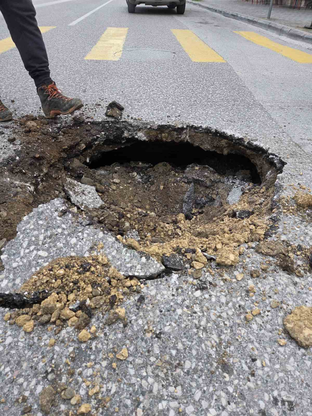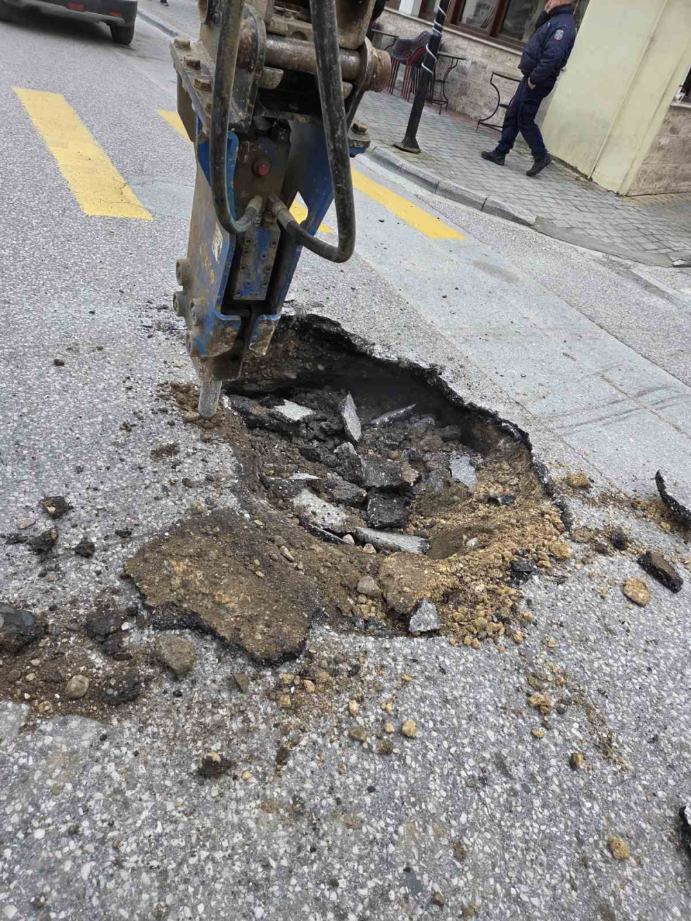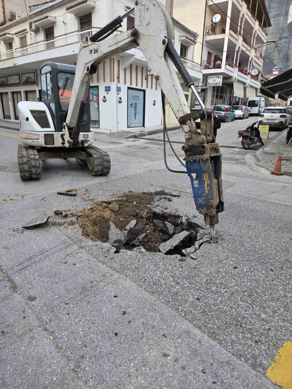Με το άνοιγμα περαιτέρω του οδοστρώματος για την αποκατάσταση αποκαλύφθηκε και ο λόγος της καθίζησης που είναι το σπάσιμο αγωγού που βρίσκεται στο σημείο!