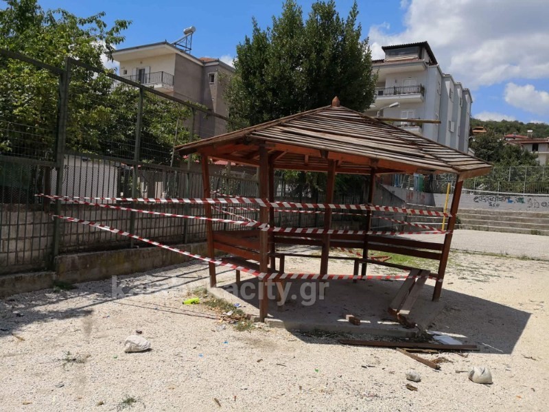 Άγνωστοι αφαίρεσαν ξύλα και στηρίγματα από το κιόσκι, έσπασαν τα παγκάκια για άγνωστο λόγο και η όλη κατασκευή είναι ιδιαίτερα επικίνδυνη πλέον για όλα τα παιδιά που παίζουν στην αυλή του σχολείου.