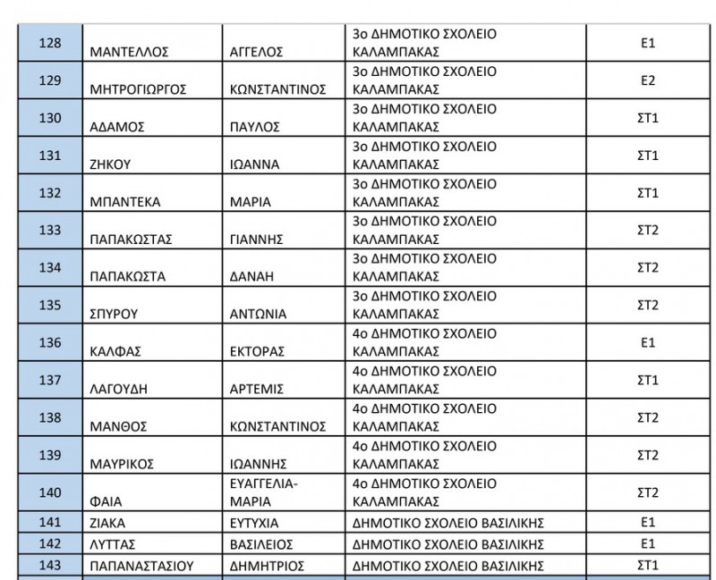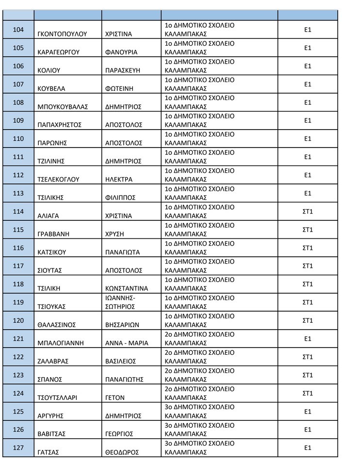 Από τα Δημοτικά σχολεία του Δήμου Μετεώρων βραβεύθηκαν 40 παιδιά και συγκεκριμένα από τα 5 δημοτικά σχολεία της Καλαμπάκας και από το Δ. Σχ. Βασιλικής και είναι: