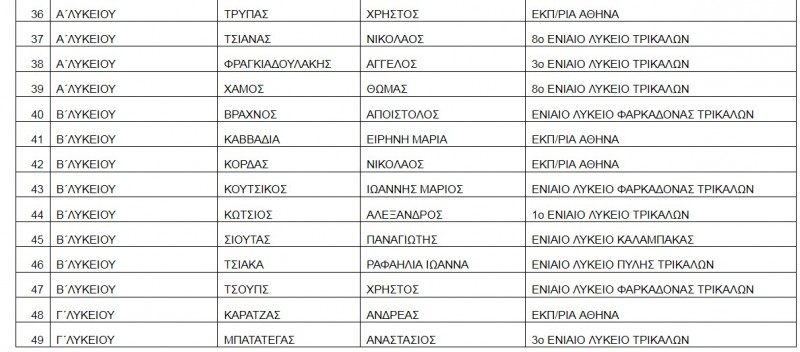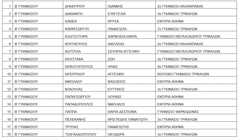 Από τα Σχολεία της Καλαμπάκας διακρίνονται οι παρακάτω μαθητές: