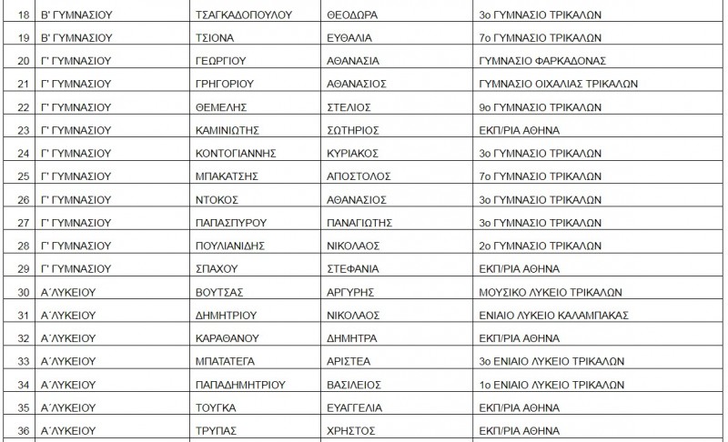 Από τα Σχολεία της Καλαμπάκας διακρίνονται οι παρακάτω μαθητές: