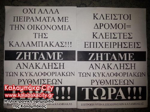 Οι αφίσες είναι από την Επιτροπή Αγώνα Επιχειρήσεων Καλαμπάκας που πλήττονται από τις νέες κυκλοφοριακές ρυθμίσεις που γίνανε στην πόλη.