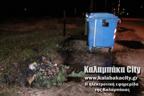 Κάρβουνο έγινε ένας πλαστικός κάδος απορριμάτων στην είσοδο της Καλαμπάκας το βράδυ της Κυριακής.