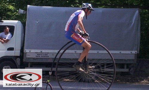 Ο συγκεκριμένος ποδηλάτης – αθλητής ( που δυστυχώς δεν έχουμε περισσότερα στοιχεία του ) διέσχισε την απόσταση Μύκανη – Καλαμπάκα ή μέρος αυτής πάνω σε αυτό το ασυνήθιστο ποδήλατο που έκλεβε τα βλέμματα των οδηγών.