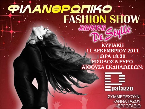 Λίγο πριν το τέλος και του 2011 όπως κάθε χρόνο και συγκεκριμένα το βράδυ της 11ης Δεκεμβρίου το κομμωτήριο De Stylle της Μαρίας και Ελένης Καρούτα συνεχίζοντας τον φιλανθρωπικού χαρακτήρα Λίγο πριν το τέλος και του 2011 όπως κάθε χρόνο και συγκεκριμένα το βράδυ της 11ης Δεκεμβρίου το κομμωτήριο De Stylle της Μαρίας και Ελένης Καρούτα συνεχίζοντας τον φιλανθρωπικού χαρακτήρα θεσμό που έχει καθιερωθεί τα τελευταία χρόνια οργανώνει ξανά το ετήσιο Fashion Show στον πολυχώρο εκδηλώσεων Pallazzo με έμφαση στο πρωτοποριακό στυλ, στα χτενίσματα και τις ιδιαίτερες δημιουργίες στην κόμμωση και μέσω των μοντέλων που θα εμφανιστούν μπροστά στο κοινό της Καλαμπάκας θα παρουσιάσει τη μοναδική αυτή εκδήλωση επιδεικνύοντας τη νέα τάση της μόδας σε ένδυση, υπόδηση, αξεσουάρ, οπτικών, κοσμημάτων…