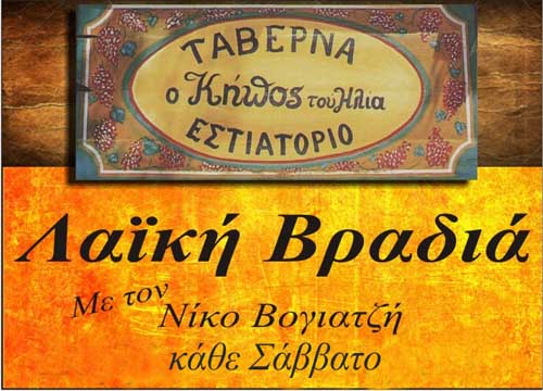 Συγκεκριμένα στο κατάστημα “Ο Κήπος του Ηλία” του κ. Ηλία Μαυραγάννη” κάθε Σάββατο βράδυ διασκεδάζετε με ζωντανή μουσική και τραγούδι από τον κ. Νίκο Βογιατζή ακούγοντας λαϊκές επιτυχίες και απολαμβάνετε την άψογη εξυπηρέτηση του καταστήματος, το καλό φαγητό και το κρασάκι… μόνο με 12 ευρώ!!!